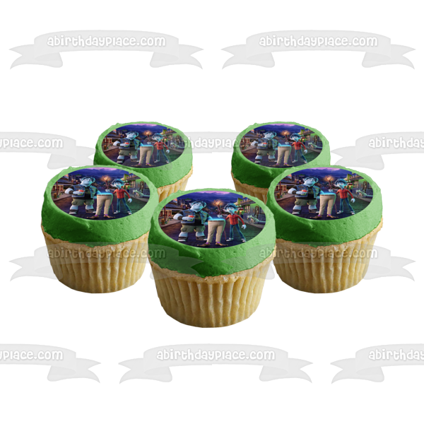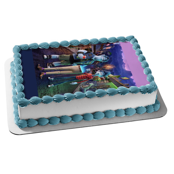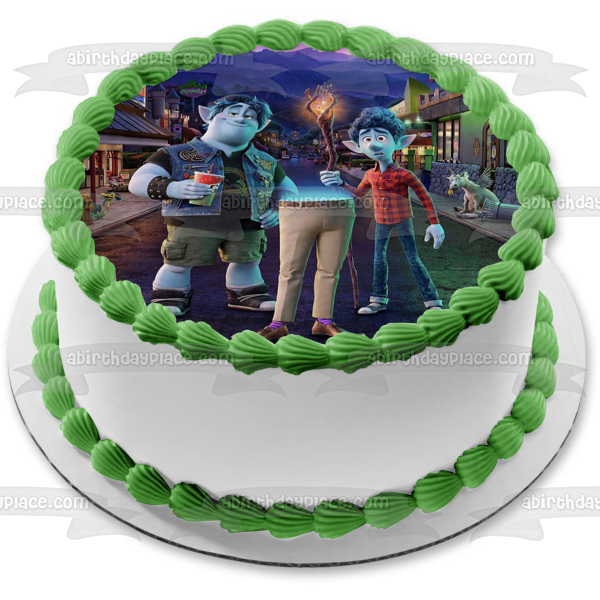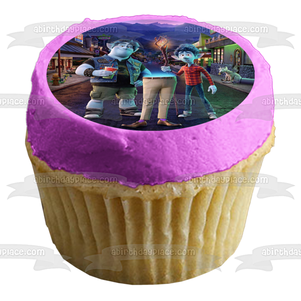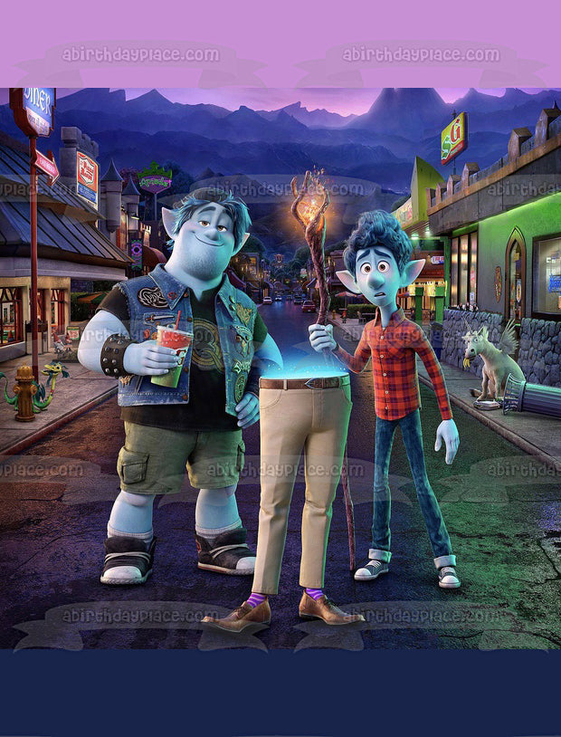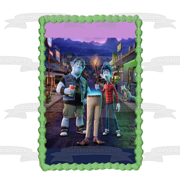 Decorate your Cake with this Onward Brothers themed Edible Cake Topper Image featuring Ian Lightfoot and his Brother Barley Lightfoot with their Ghost Father in a Magical Elve Town!