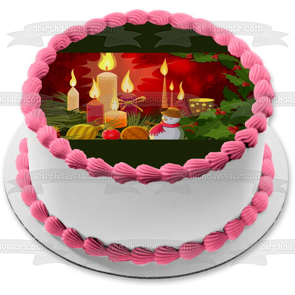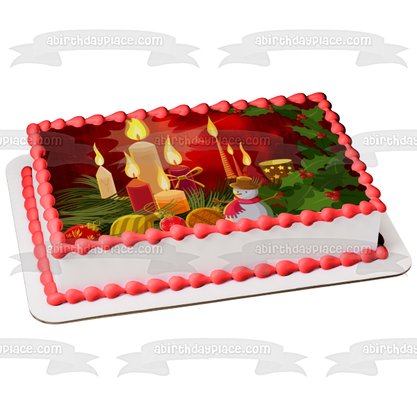 Decorate your Cake with this Christmas themed Edible Cake Topper Image featuring Christmas Candles, Ball Ornaments, a Snowman and Holly!