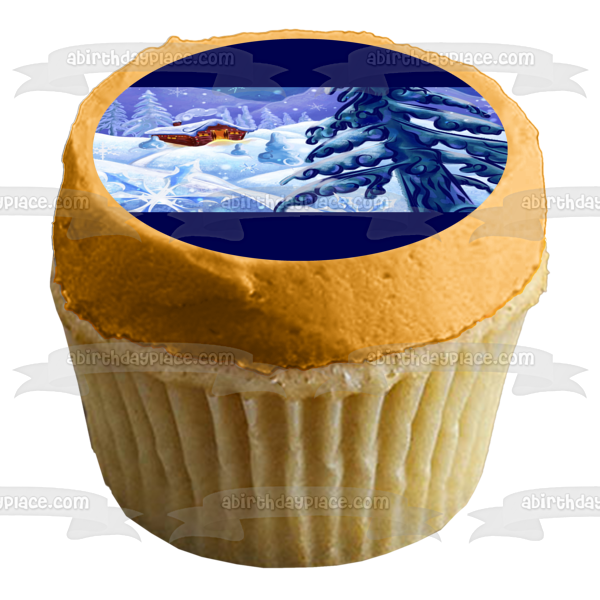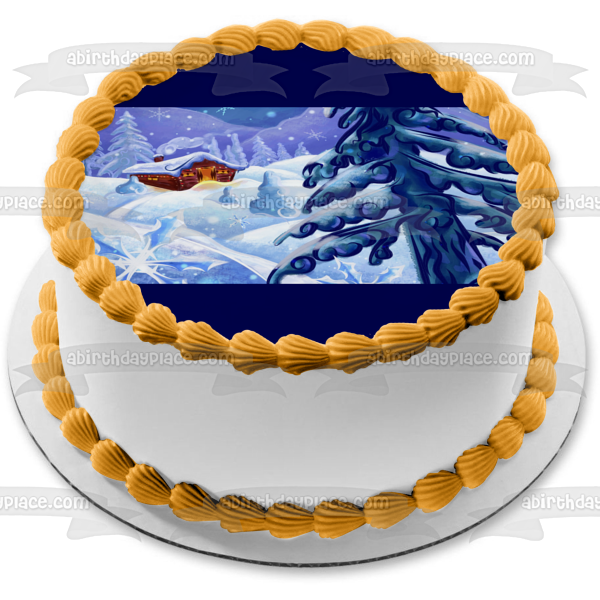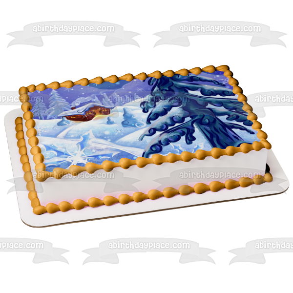 Decorate your Cake with this Christmas themed Edible Cake Topper Image featuring a Christmas Cabin covered in Snow!