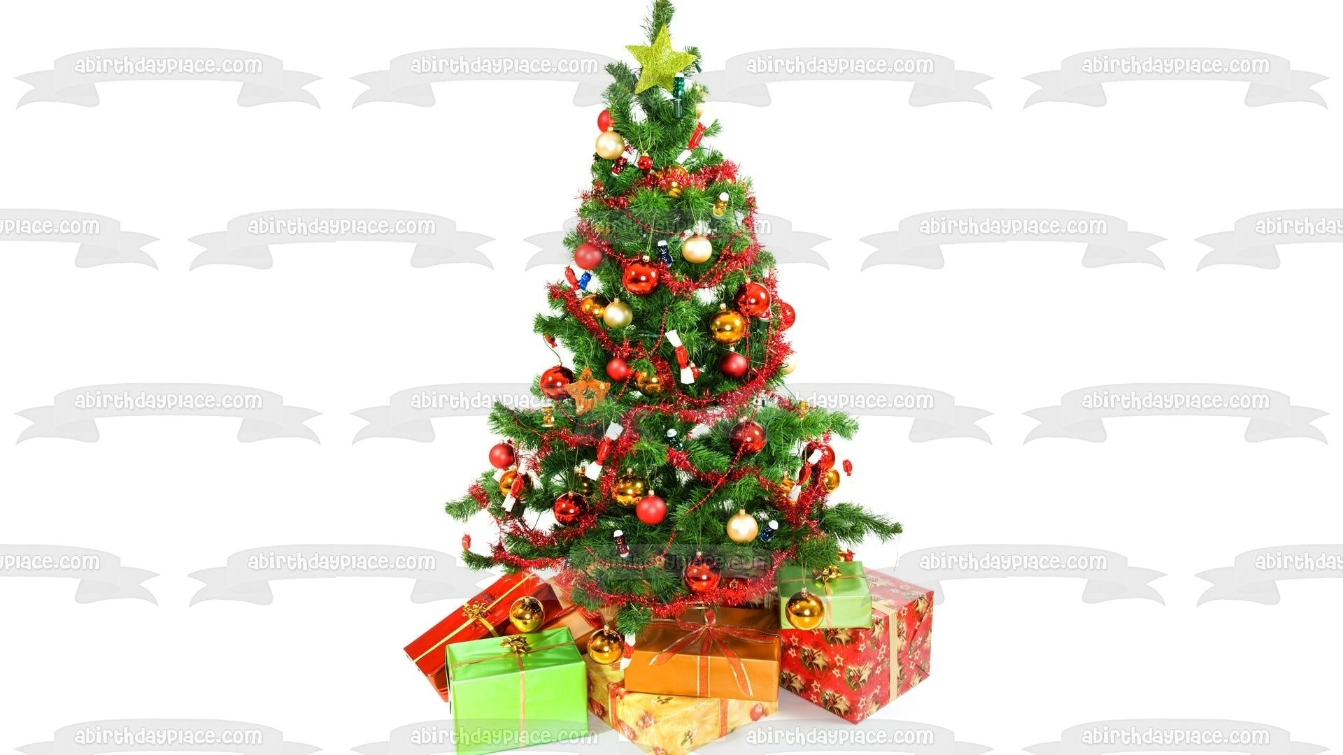 Decorate your Cake with this Christmas themed Edible Cake Topper Image featuring a Christmas Tree decorated with Ball Ornaments and Surrounded by Christmas Presents!