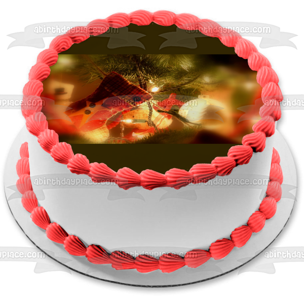Decorate your Cake with this Christmas themed Edible Cake Topper Image featuring a Christmas Tree decorated with Christmas Lights, Ball Ornaments and a Stocking!