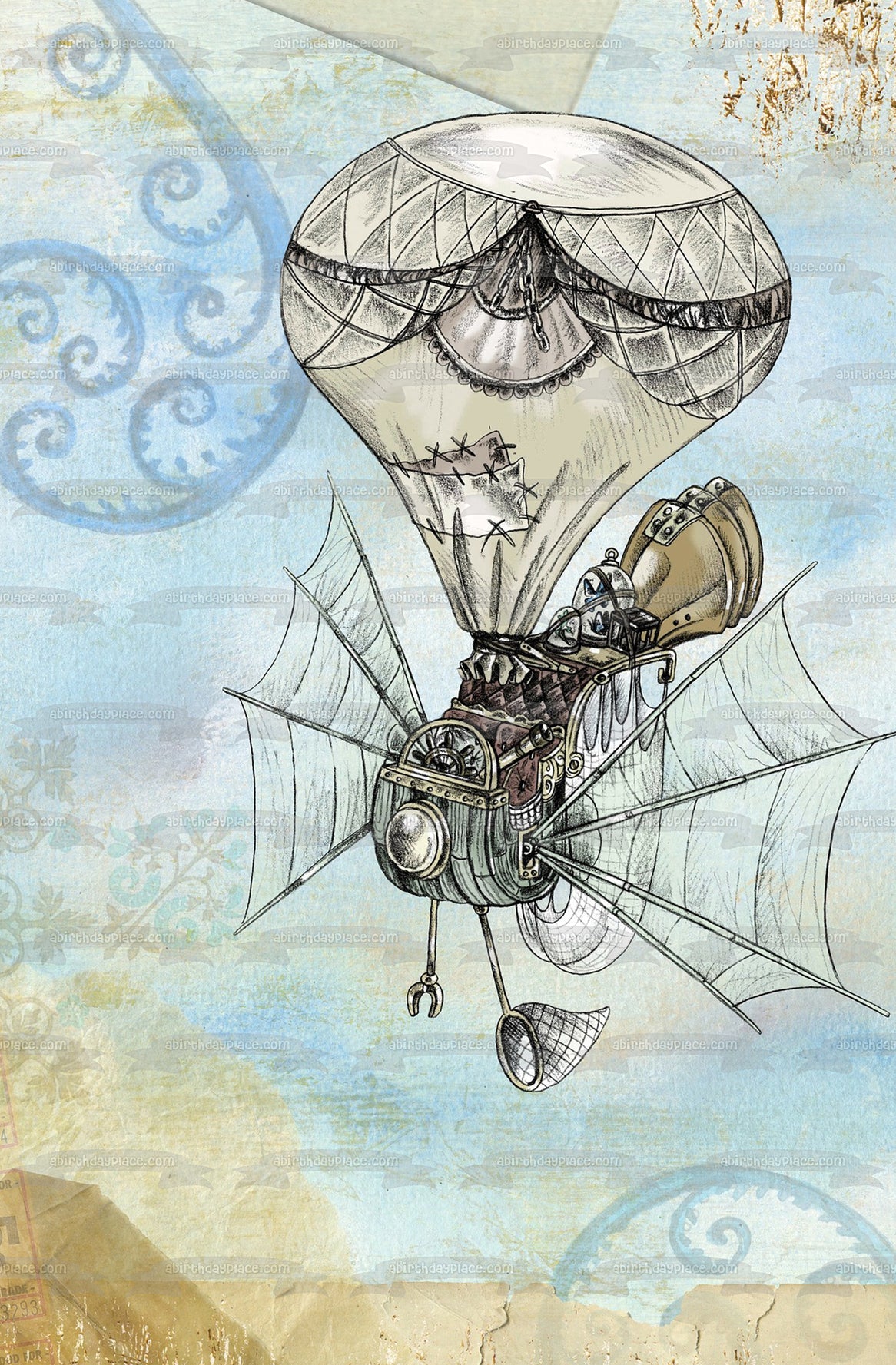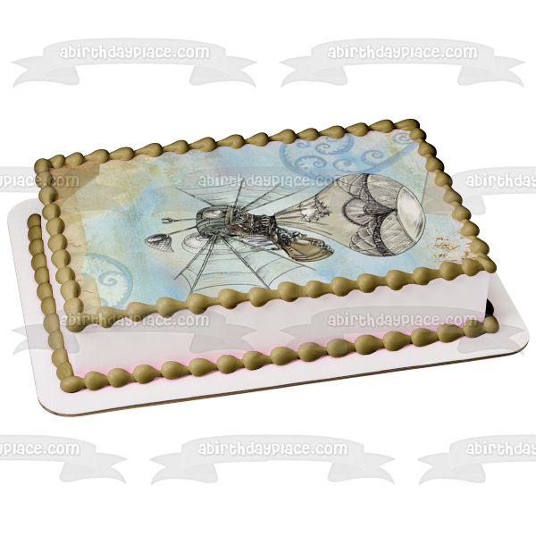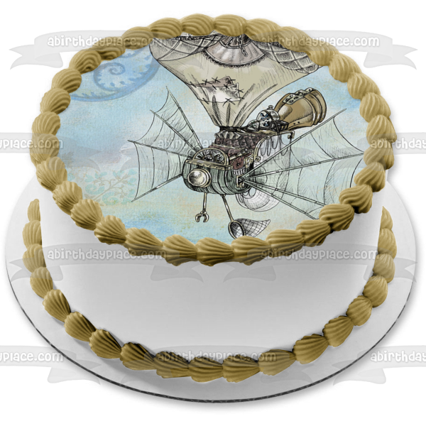 Steampunk Airtravel Gears Whimsical Blue Tan Whimsical Edible Cake Topper Image ABPID50744