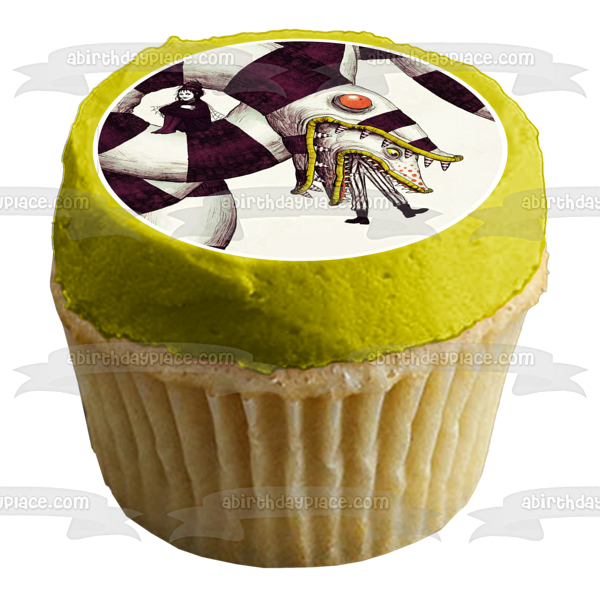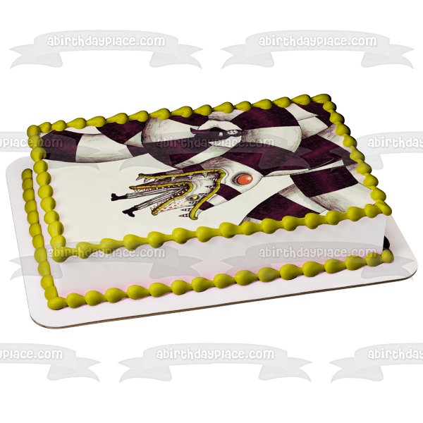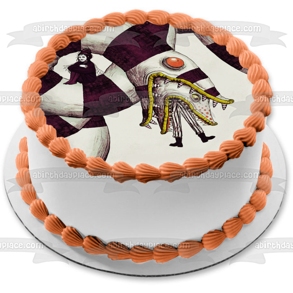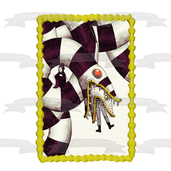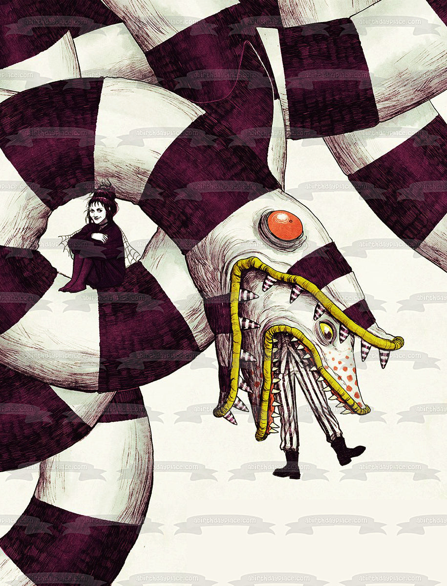 Decorate your Cake with this Beetlejuice themed Edible Cake Topper Image featuring Beetlejuice getting Eaten by a Sandworm from Saturn and Lydia sitting on It!