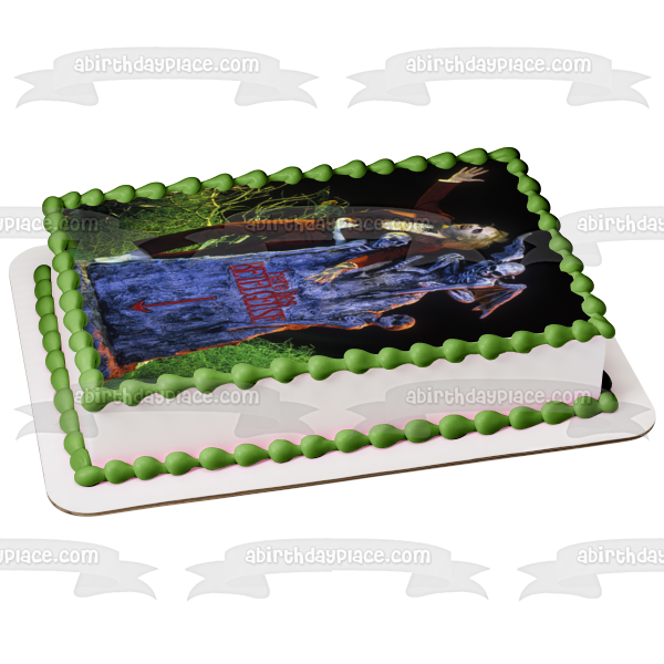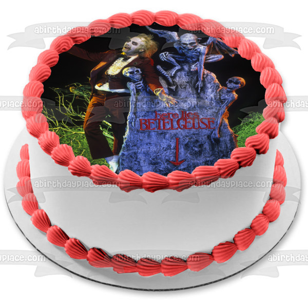 Decorate your Cake with this Beetlejuice themed Edible Cake Topper Image featuring him Next to Betelgeuse's Headstone with Rock Skeletons and the words Here Lies Betelgeuse!