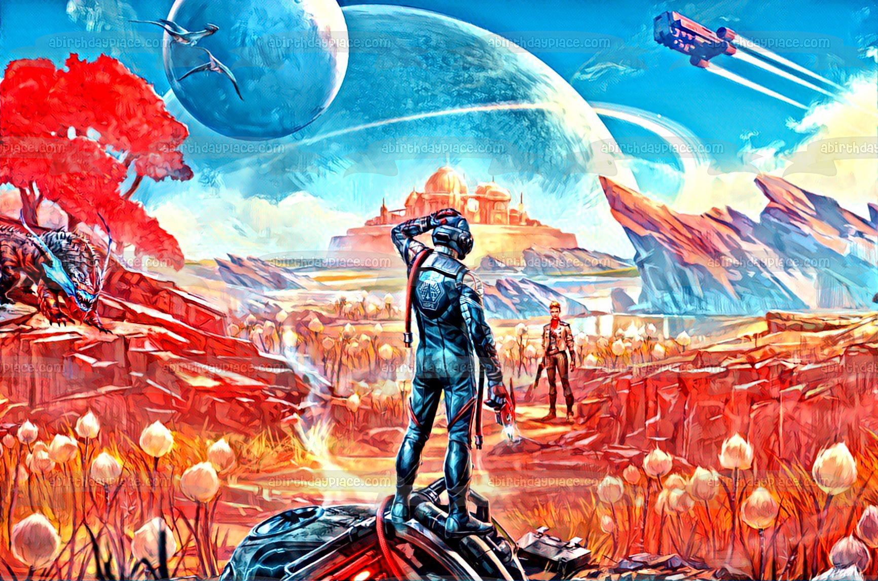 Decorate your Cake with this The Outer Worlds themed Edible Cake Topper Image featuring Stranger looking out at the Mountains!