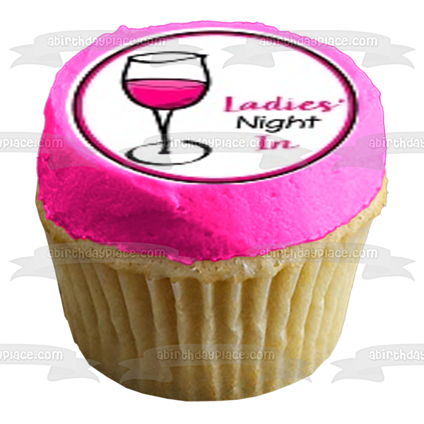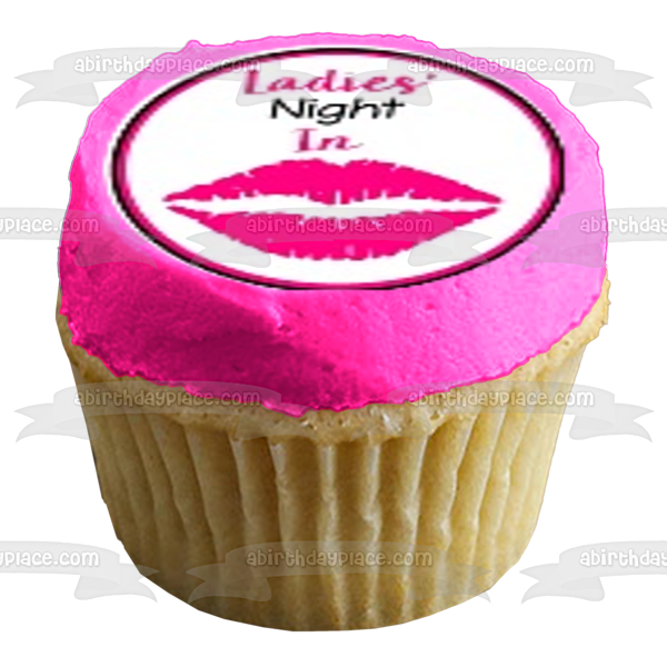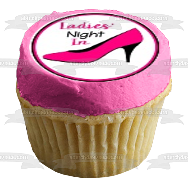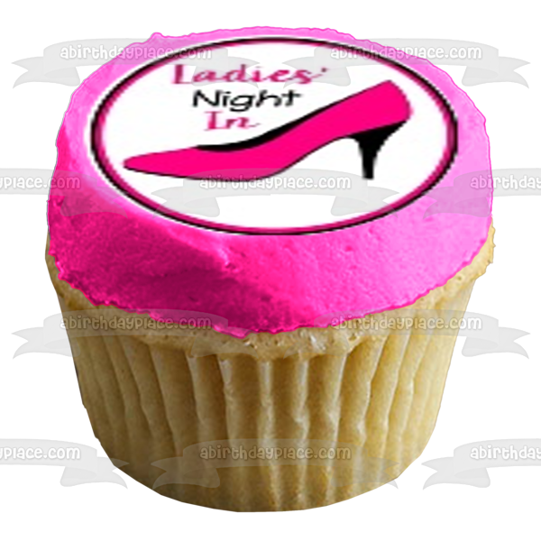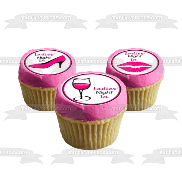 Decorate your Cupcakes with these 12 Count Ladie's Night In themed Edible Cupcake Topper Images featuring a Pink Wine Glass, Pink High Heel Shoe and a Pink Kiss Lips!