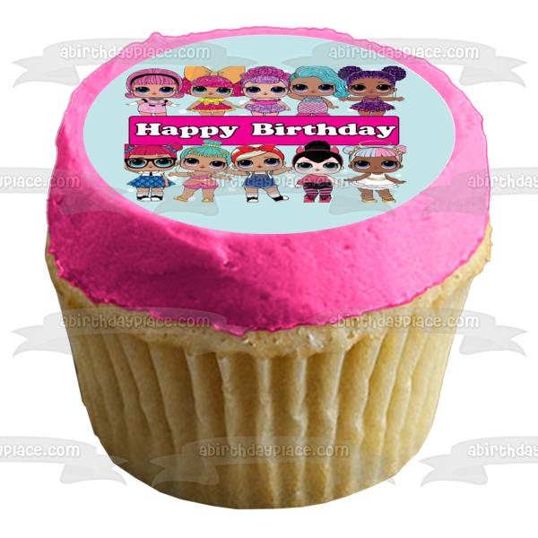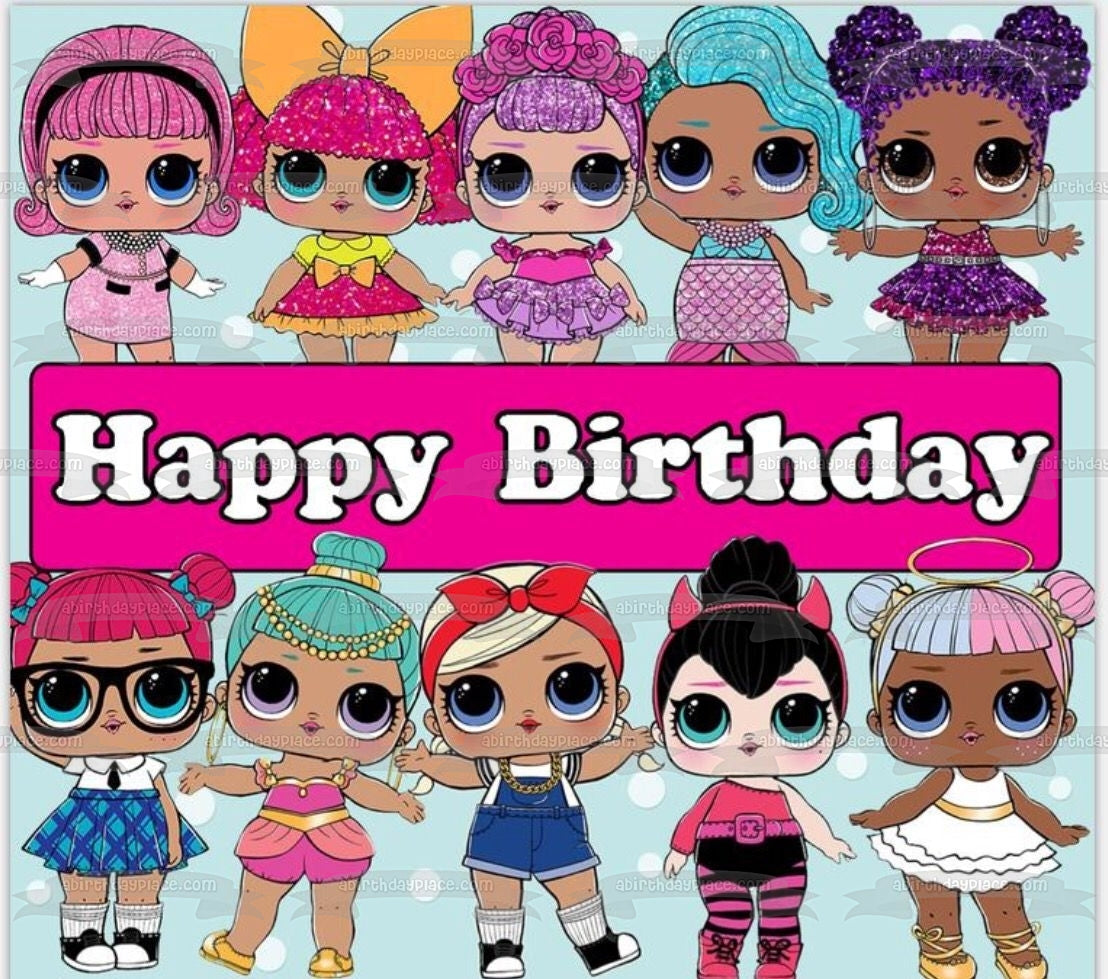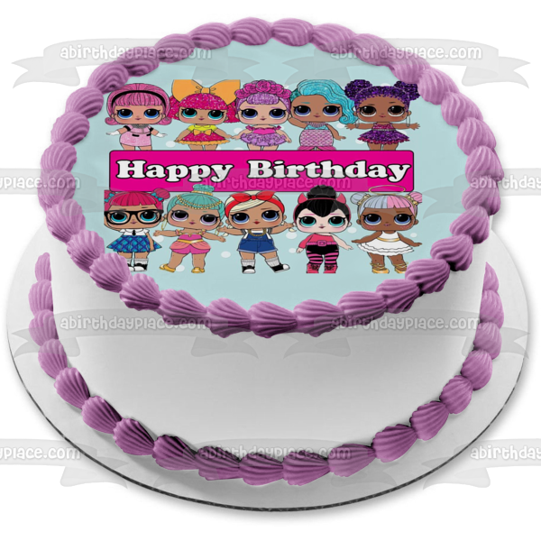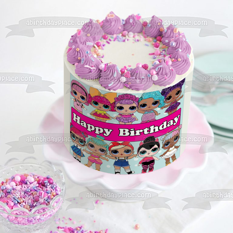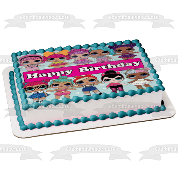 Decorate your Cake with this LOL Surprise Happy Birthday themed Edible Cake Topper Image featuring Teacher's Pet, Splash Queen, Sugar, Spice, Glitter Queen, Sugar Queen, Genie, Shorty and Purple Queen!