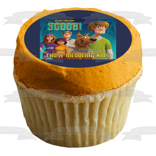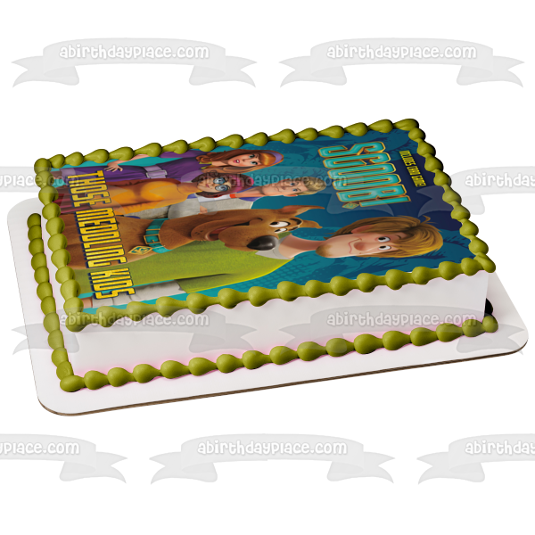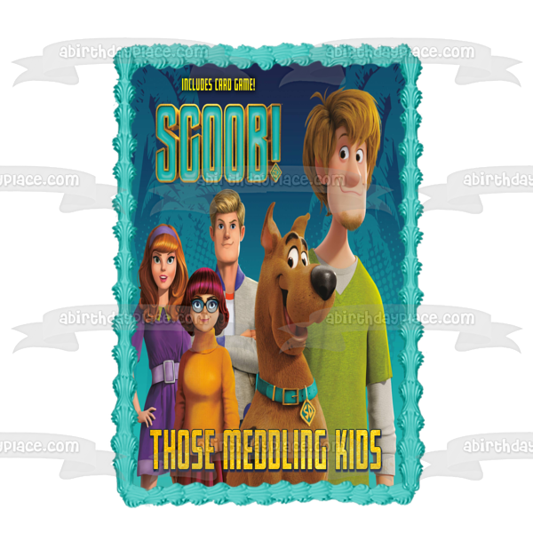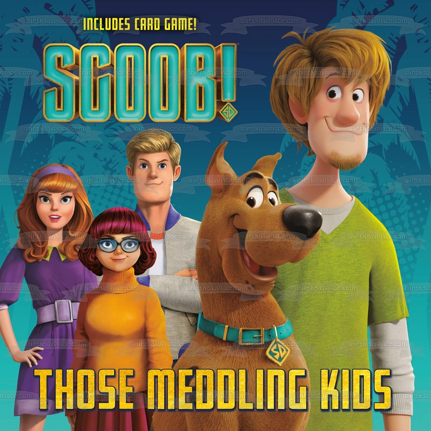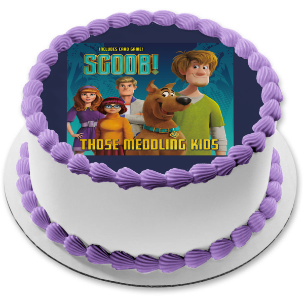Decorate your Cake with this Scoob! themed Edible Cake Topper Image featuring the Movie Cover with Scooby Doo, Velma, Shaggy, Veronica, Fred and the words Those Meddling Kids!