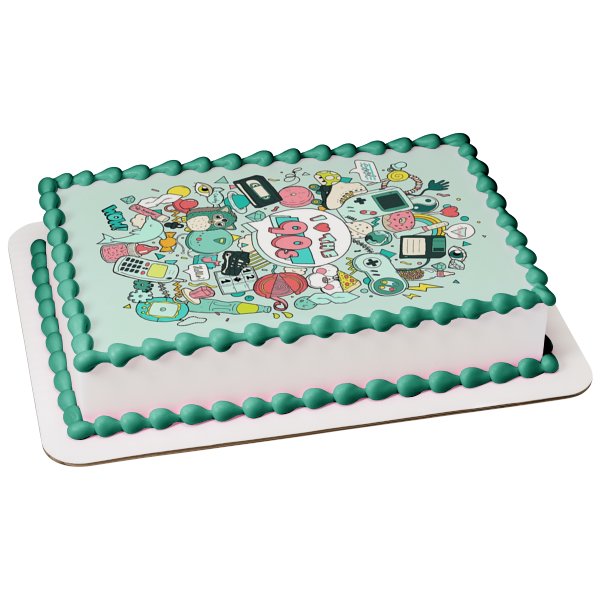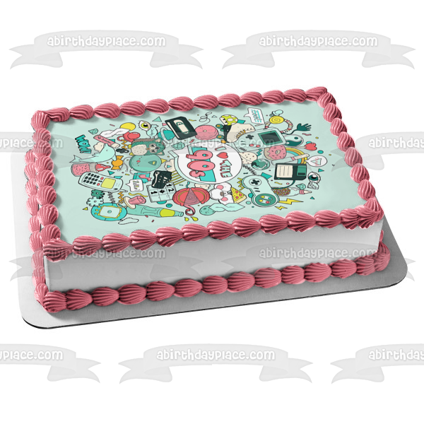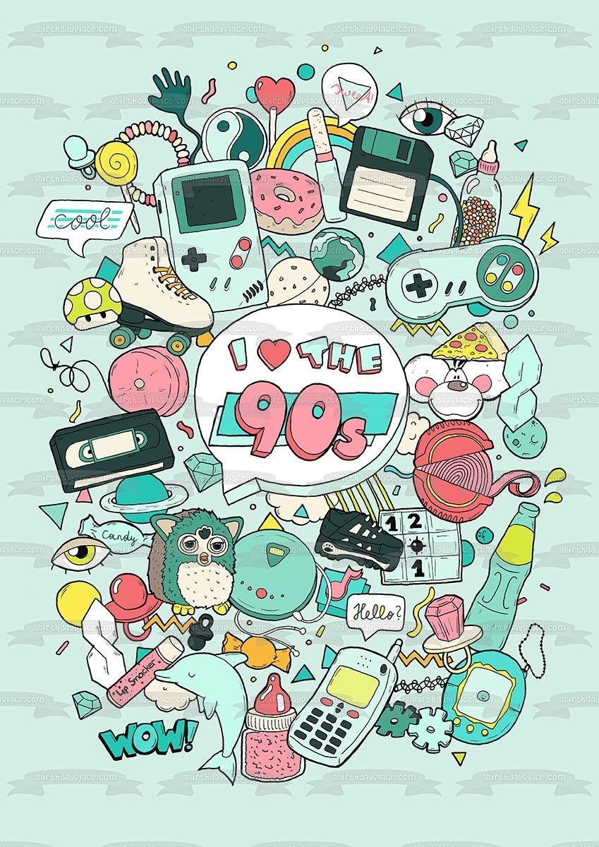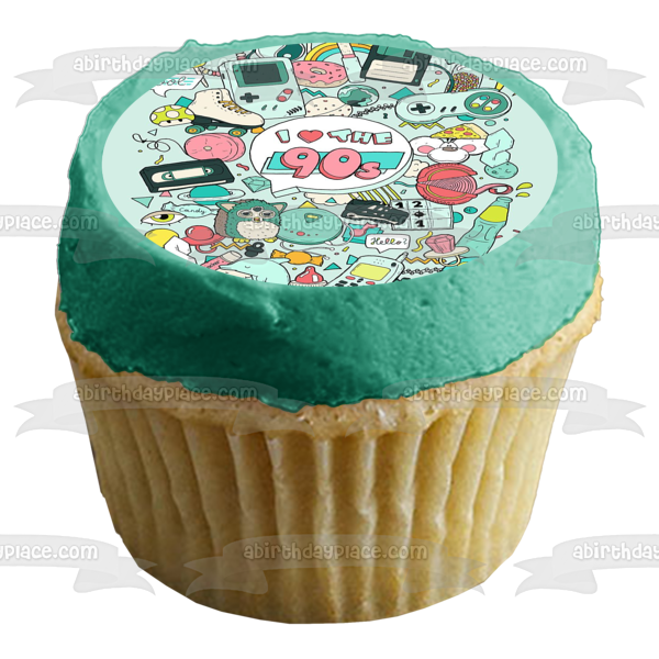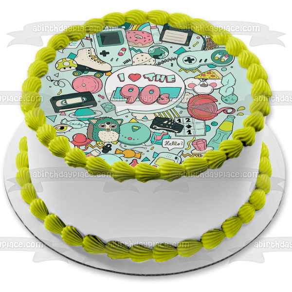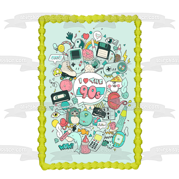 Decorate your Cake with this I Love the 90's Memorabilia themed Edible Cake Topper Image featuring a Ying Yang sign, VCR Tape, Nintendo Paddle, Floppy Disk, Rainbows, Furby, Lip Smacker Chapstick ,Yo-Yo, Bubble Tape, Roller Skates a GameBoy and More!