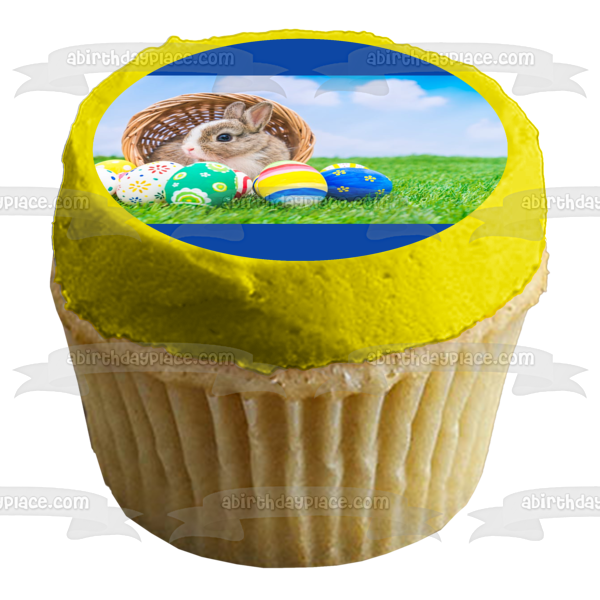 Decorate your Cake with this Happy Easter themed Edible Cake Topper Image featuring a Bunny in a Basket with Colorful Easter Eggs!