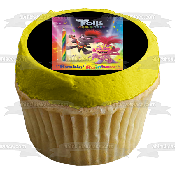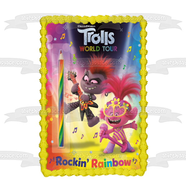Decorate your Cake with this Trolls World Tour themed Edible Cake Topper Image featuring Poppy Singing and Queen Barb Playing Guitar!