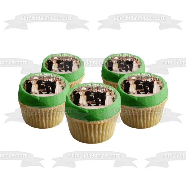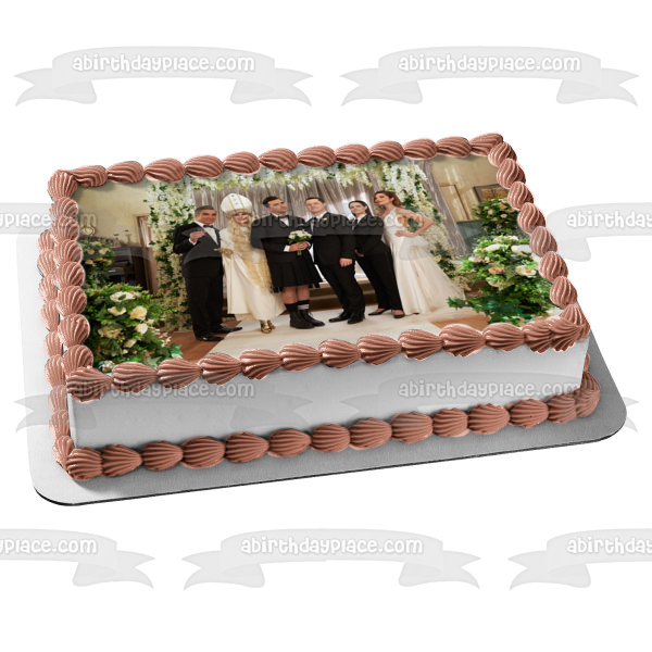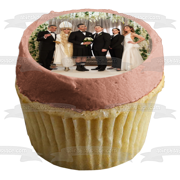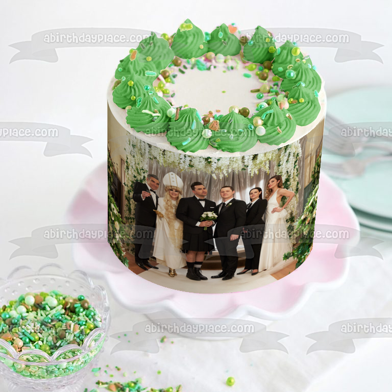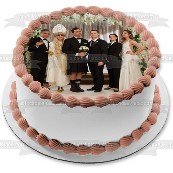 Decorate your Cake with this Schitt's Creek Season 6 themed Edible Cake Topper Image featuring David and Patrick's Wedding with Johnny, Moira, David, Patrick, Stevie and Alexis!
