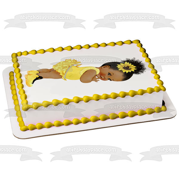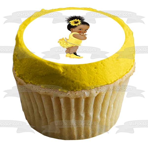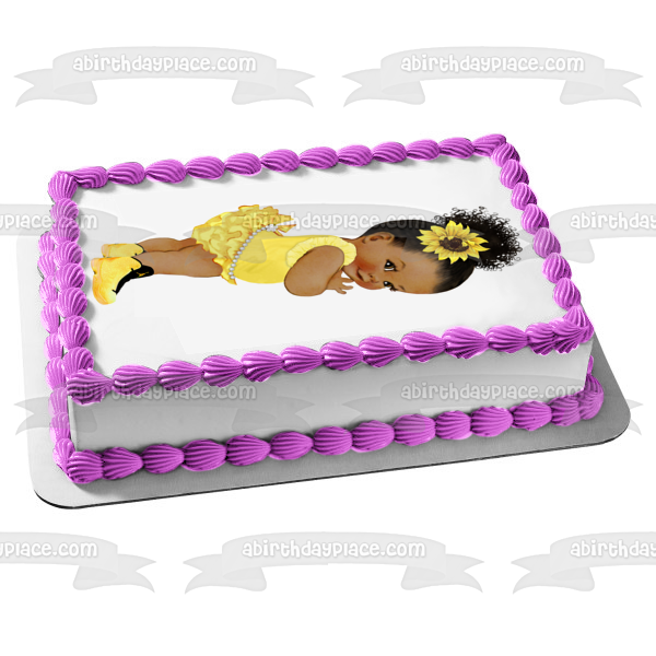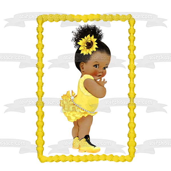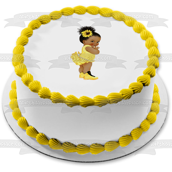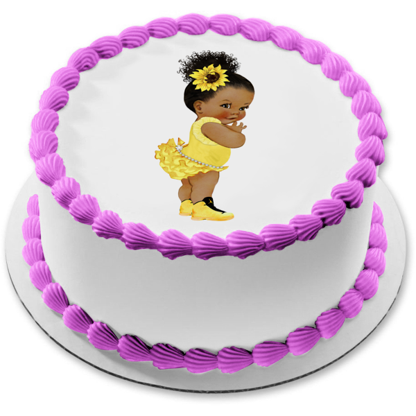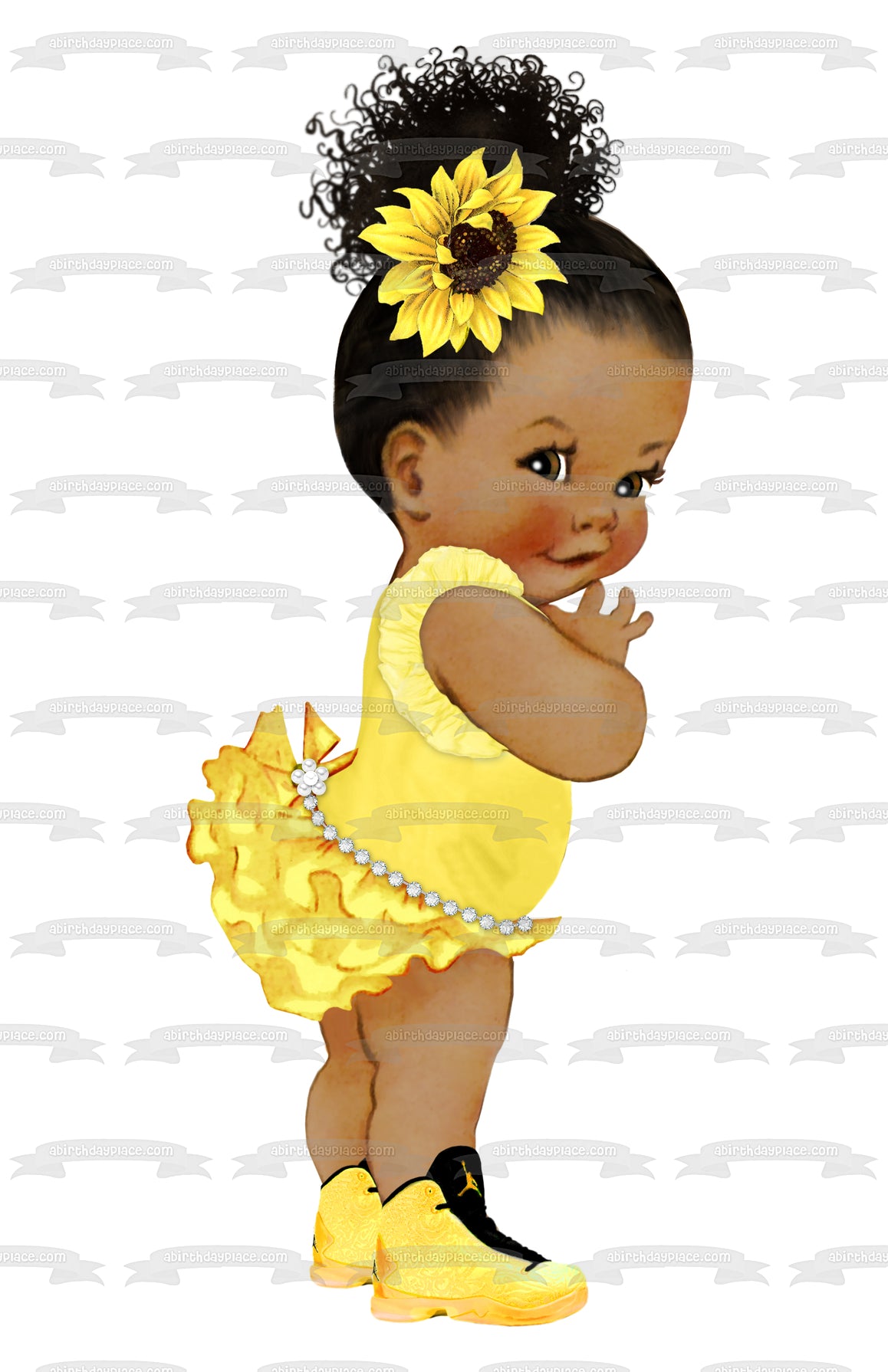 Decorate your Cake with this Baby Girl themed Edible Cake Topper Image featuring an African American Baby Girl Sunflower Yellow Tutu Jordan Sneakers