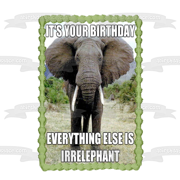 Meme Happy Birthday Elephant "It's Your Birthday Everything Else Is Irrelephant" Edible Cake Topper Image ABPID51479