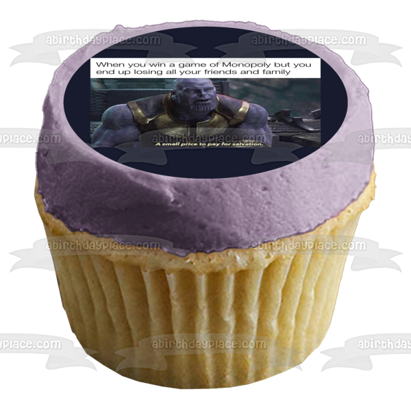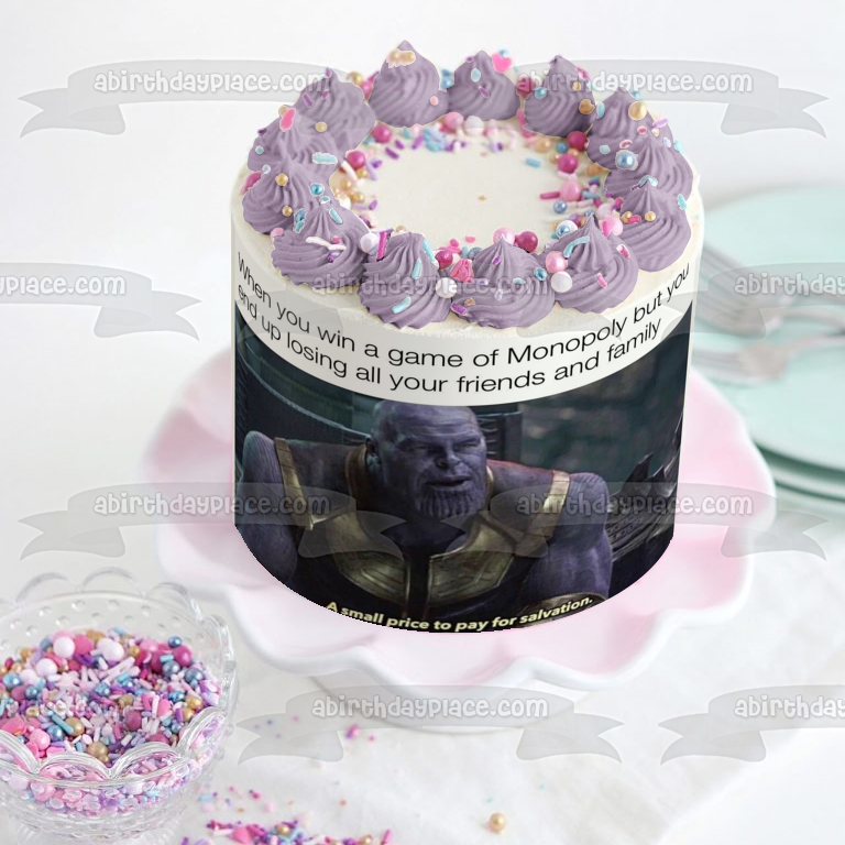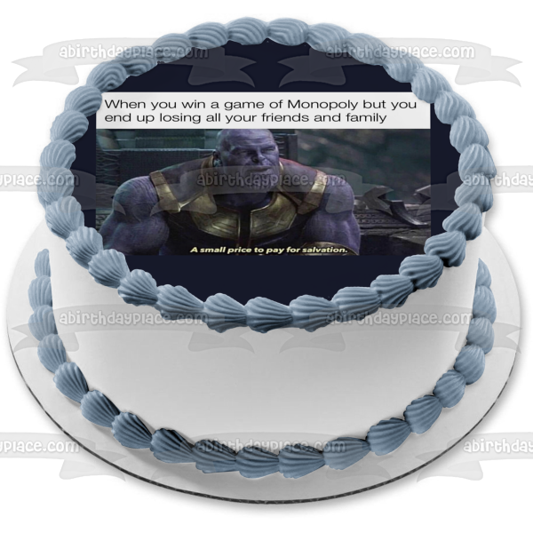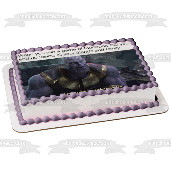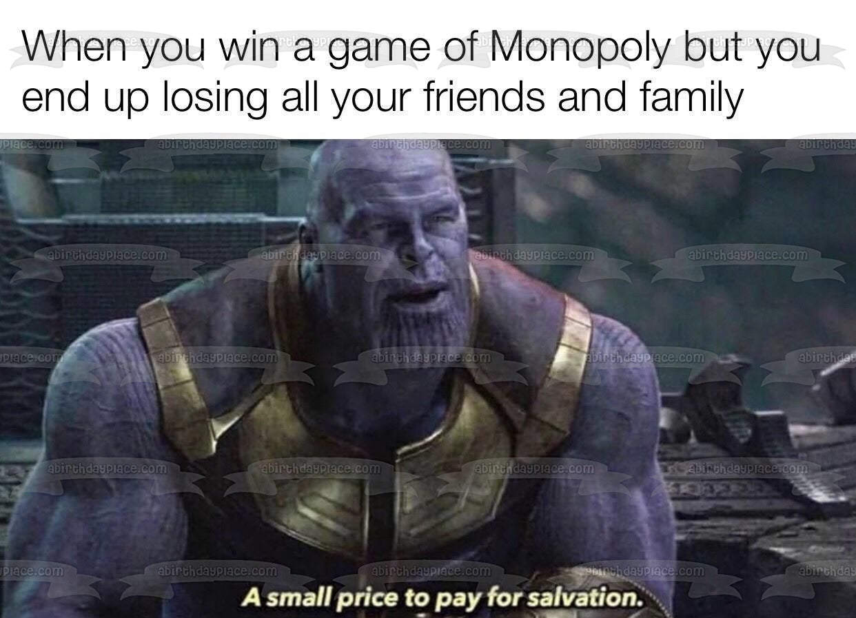 Decorate your Cake with this Winning Monopoly Meme themed Edible Cake Topper Image featuring the words "When you win a game of Monopoly but you end up losing all your friends and family...A small price to pay for salvation"!