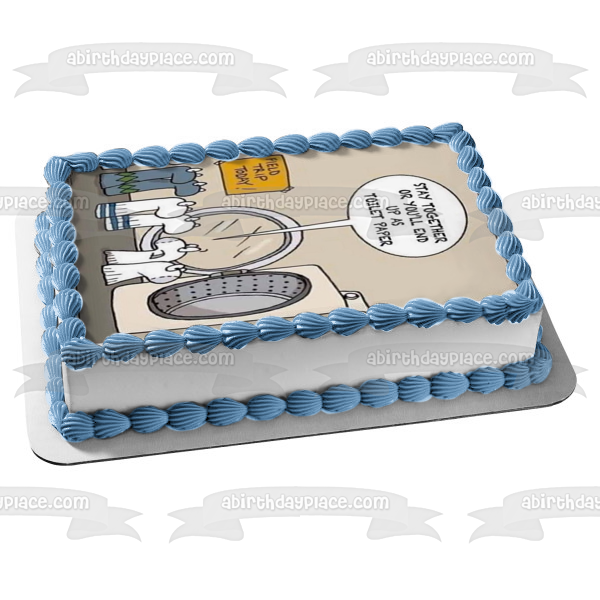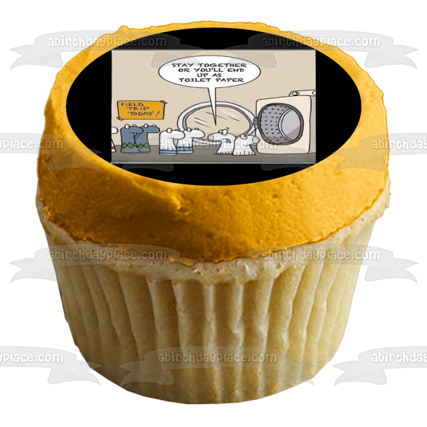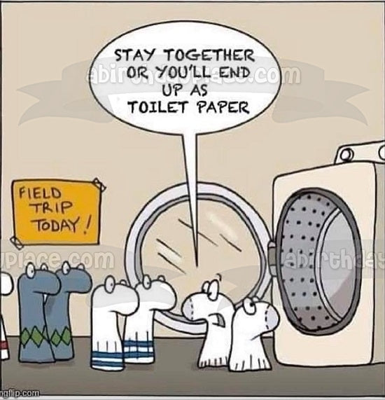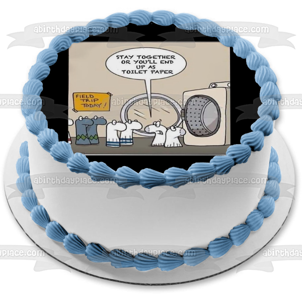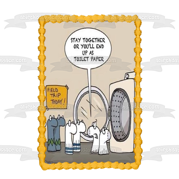 Decorate your Cake with this Coronavirus Meme themed Edible Cake Topper Image featuring Socks at a Laundry Mat saying "Stay together or you'll end up as toilet paper"!