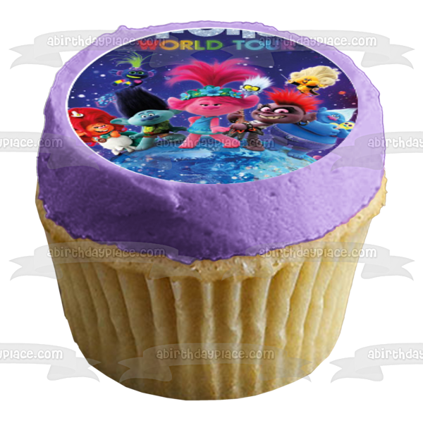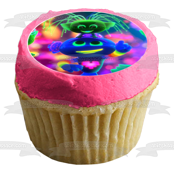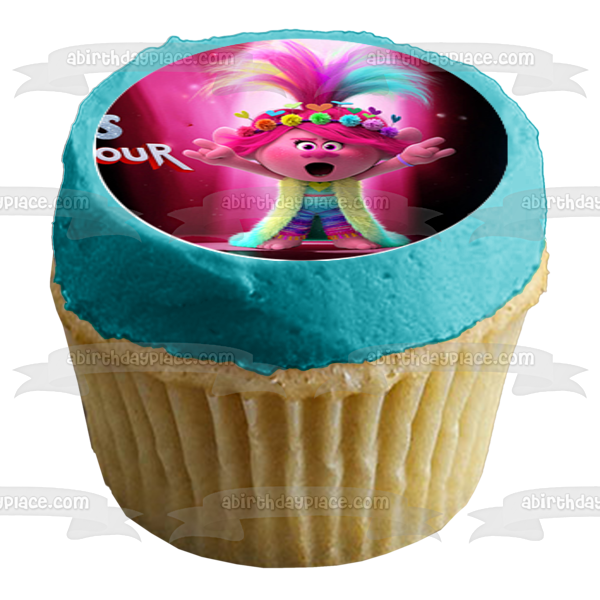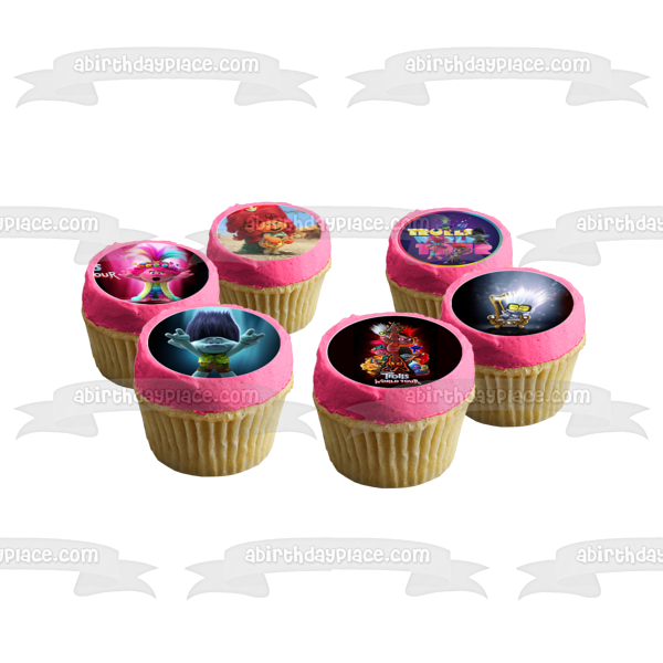 Decorate your Cupcakes with these 12 Count Trolls World Tour themed Edible Cake Topper Image featuring Queen Poppy, Queen Barb, Branch, Tiny Diamond and King Trollex!