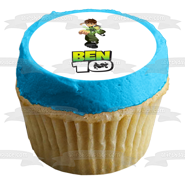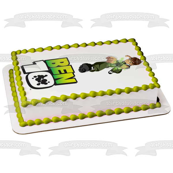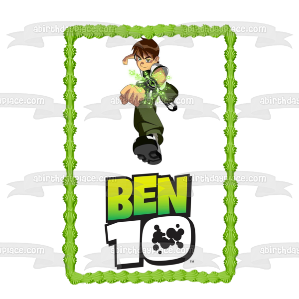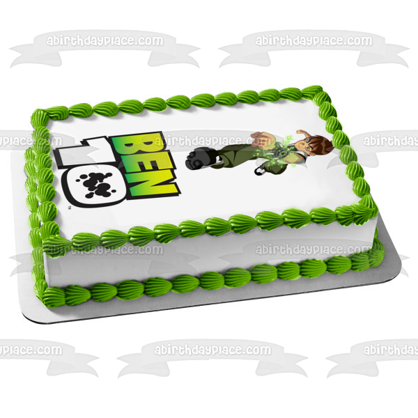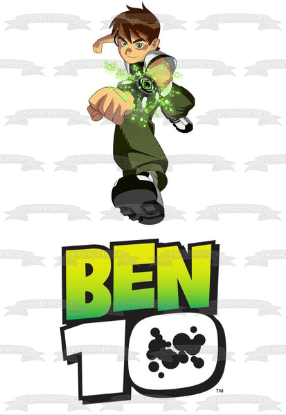 Decorate your Cake with this Ben 10 themed Edible Cake Topper Image featuring Ben Tennyson Lunging on top of the Ben 10 Logo