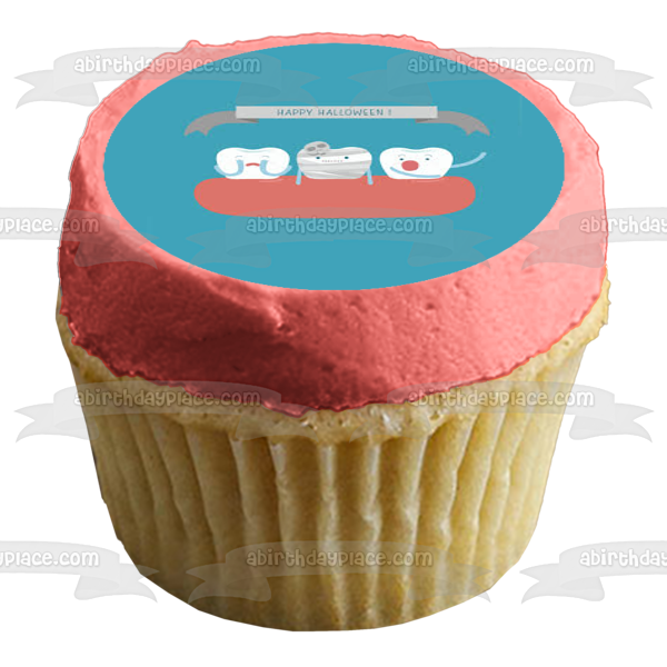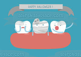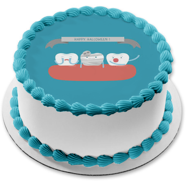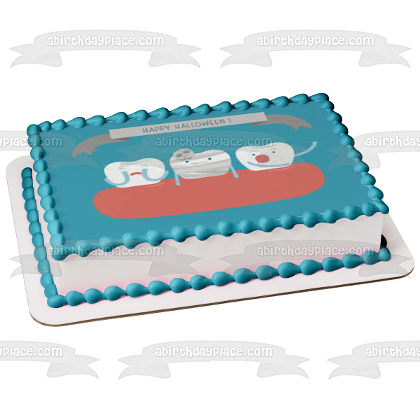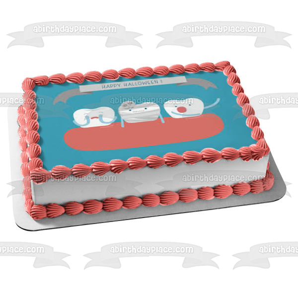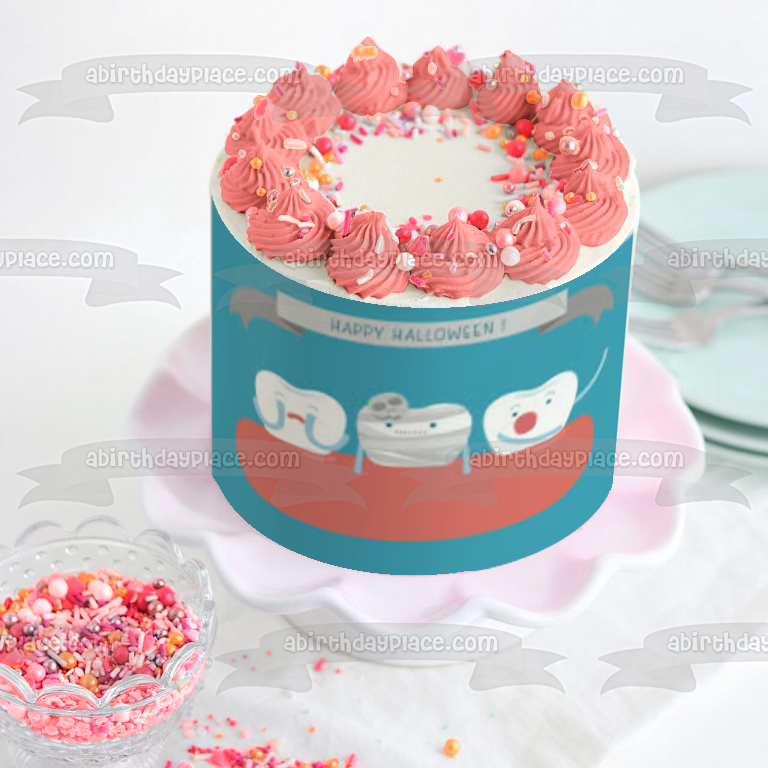 Decorate your Cake with this Happy Halloween themed Edible Cake Topper Image featuring a group of Sweet Teeth!