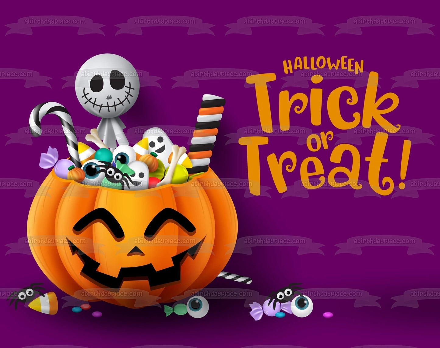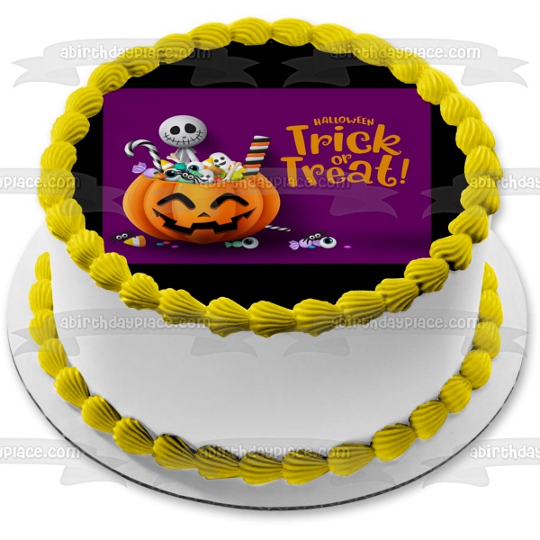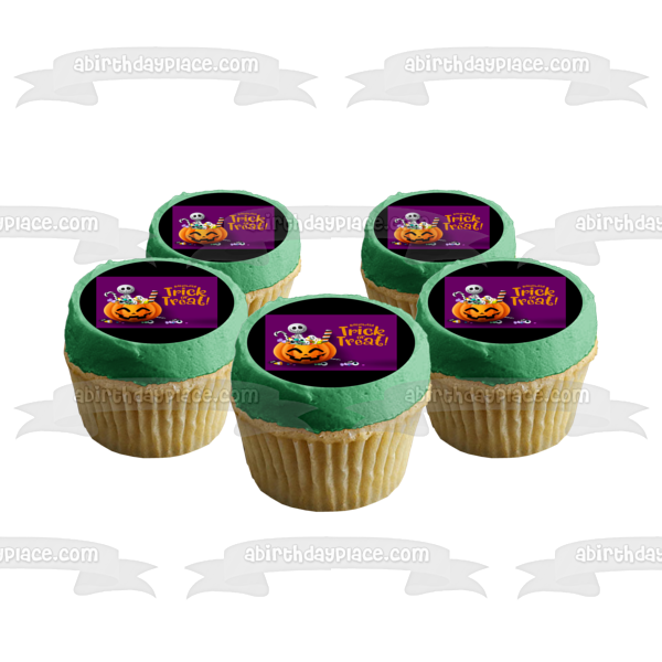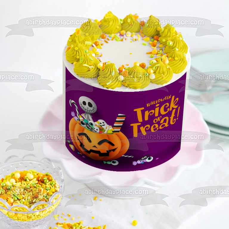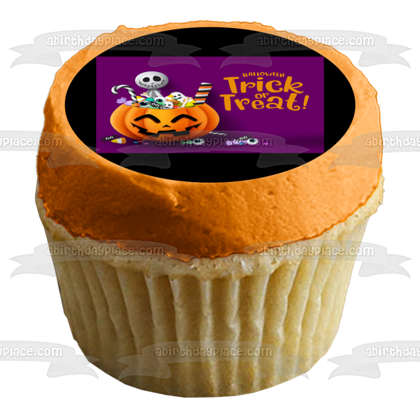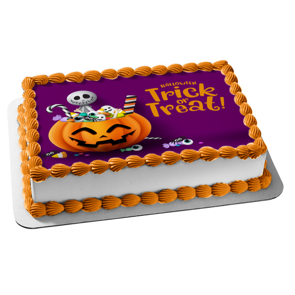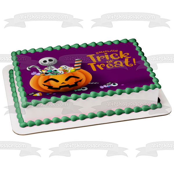 Decorate your Cake with this Trick Or Treat Happy Halloween themed Edible Cake Topper Image featuring a Skeleton and Candy Filled Jack-O-Lantern!