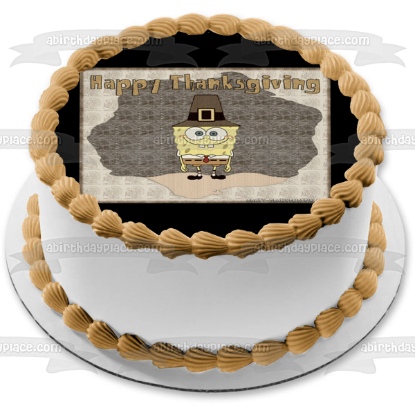 Decorate your Cake with this SpongeBob SquarePants Happy Thanksgivng themed Edible Cake Topper Image featuring SpongeBob in a Pilgrim Costume!