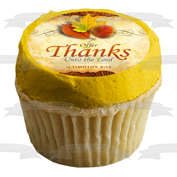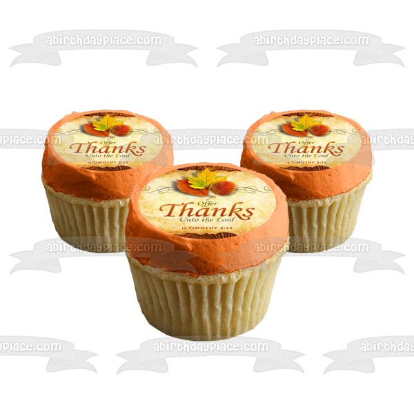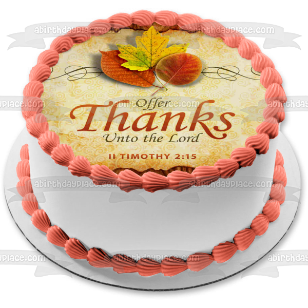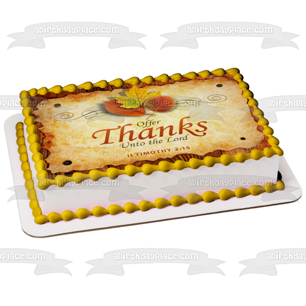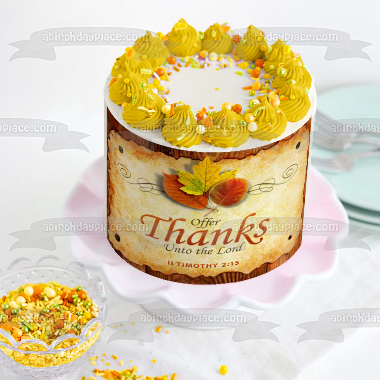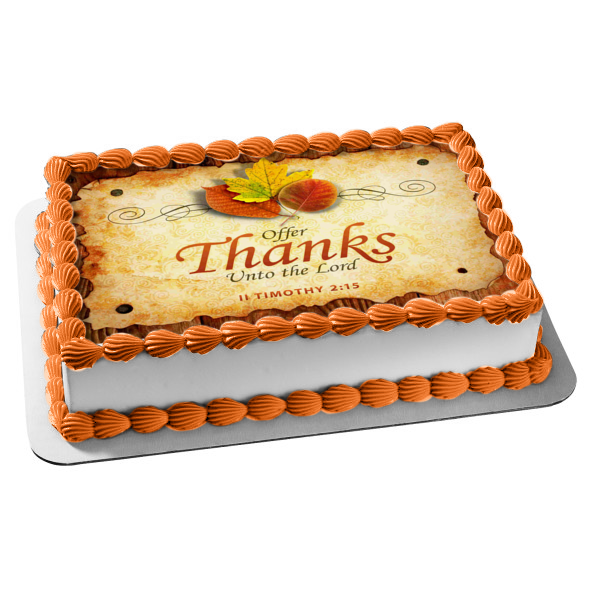 Decorate your Cake with this Inspirational Religious Happy Thanksgiving themed Edible Cake Topper Image featuring Fall Colored Leaves and the words "Offer Thanks Unto the Lord Timothy 2:15"!