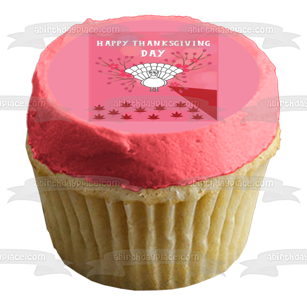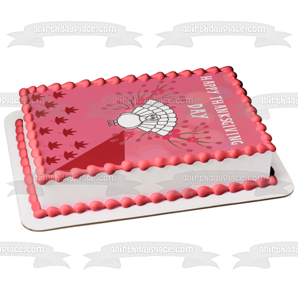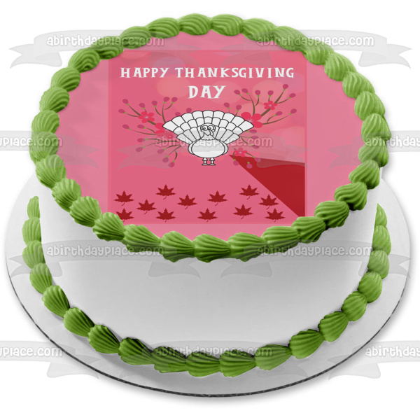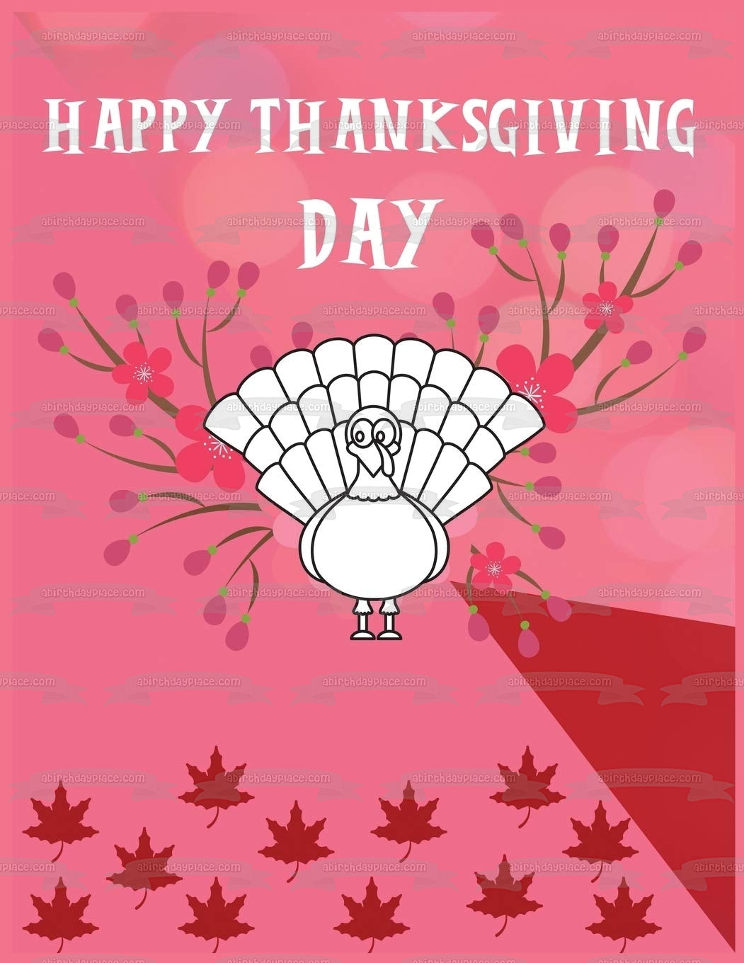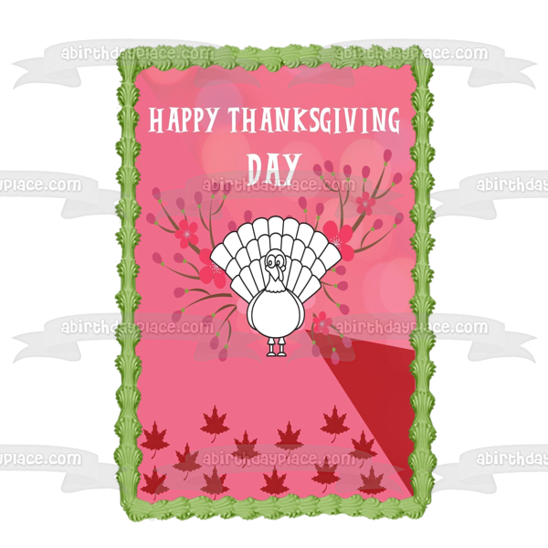 Decorate your Cake with this Happy Thanksgiving Day themed Edible Cake Topper Image featuring a Turkey surrounded by Leaves and Flowers with a Pink Background!