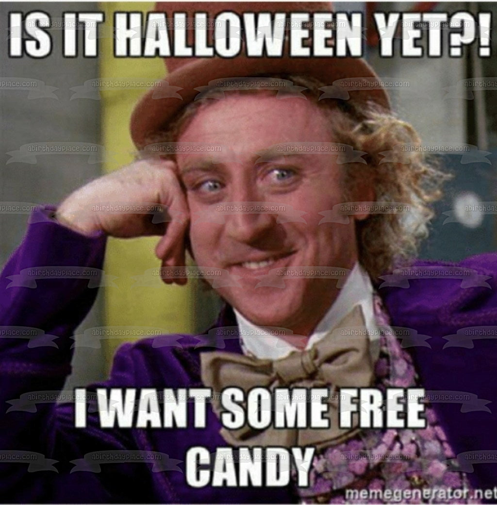 Decorate your Cake with this Willy Wonka and the Chocolate Factory Halloween Meme themed Edible Cake Topper Image featuring Willy Wonka and the words "Is it Halloween yet?! I want some free candy"!