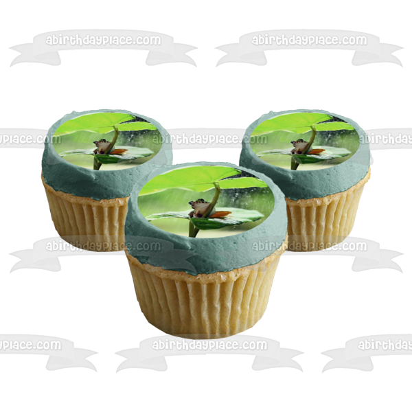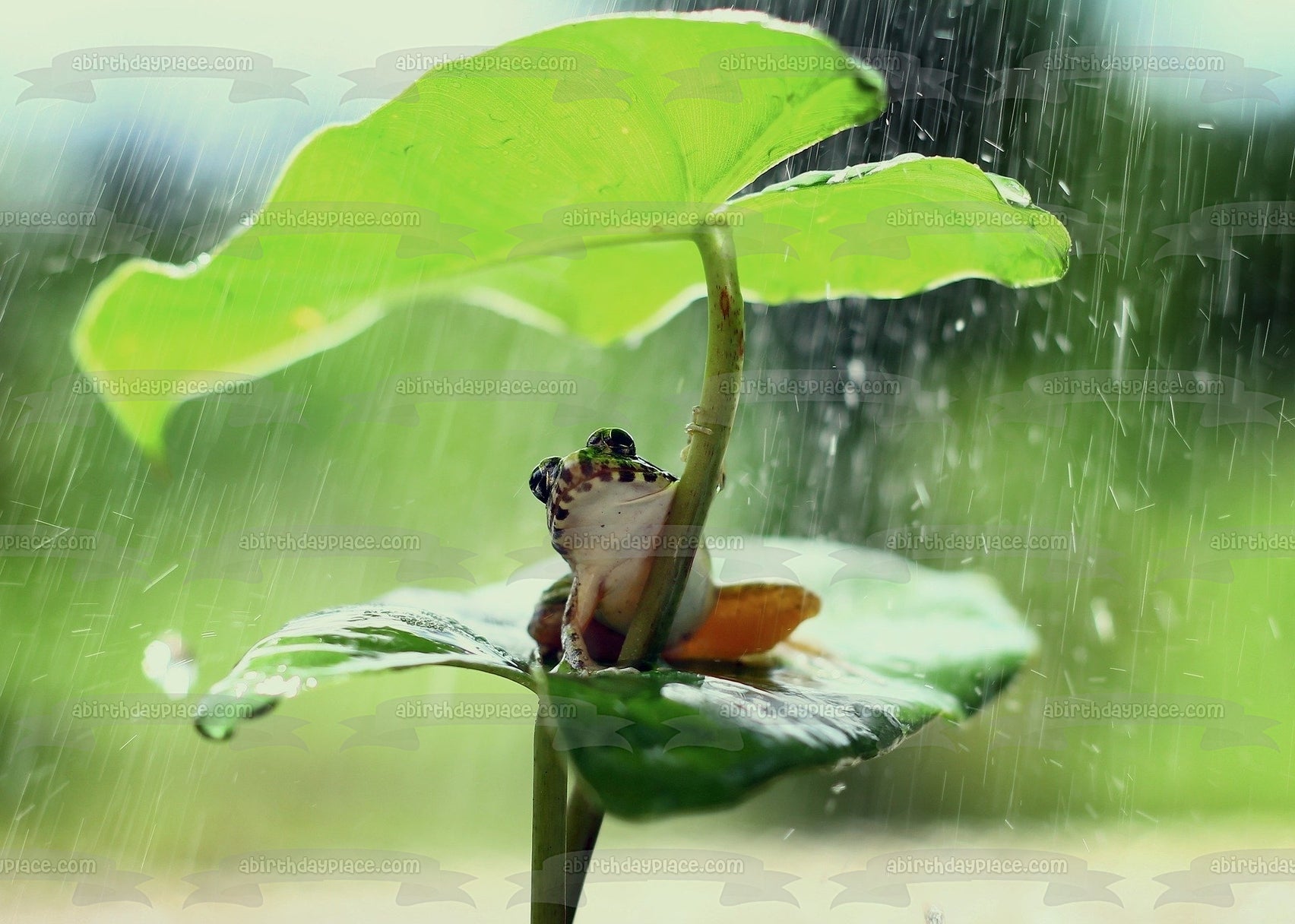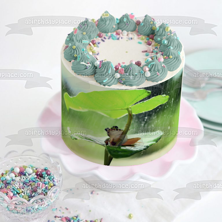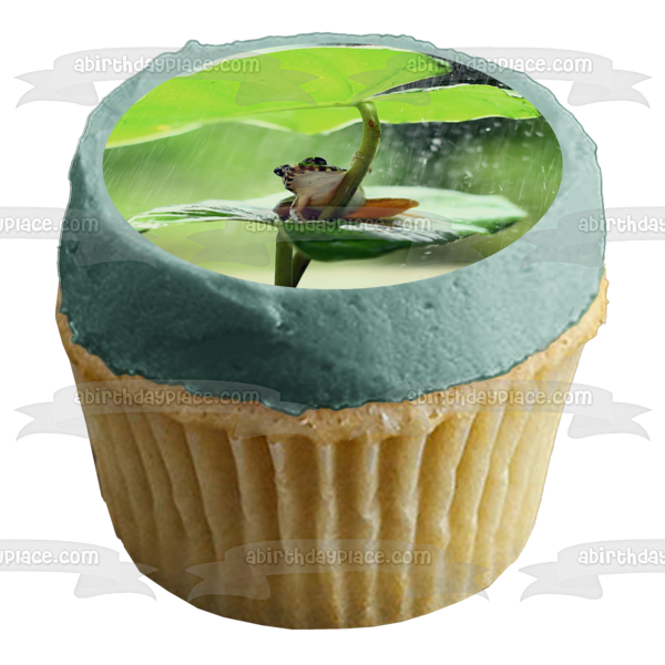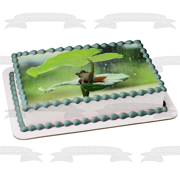 Decorate your Cake with this Wildlife themed Edible Cake Topper Image featuring a Frog on a Leaf in the Rain!