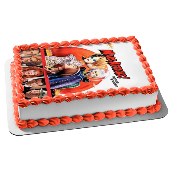 Decorate your Cake with this Mars Attacks Movie Poster themed Edible Cake Topper Image featuring Martian Girl, Art Land, First Lady Marsha Dale and Professor Donald Kessler!