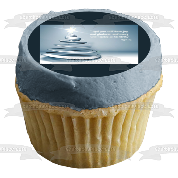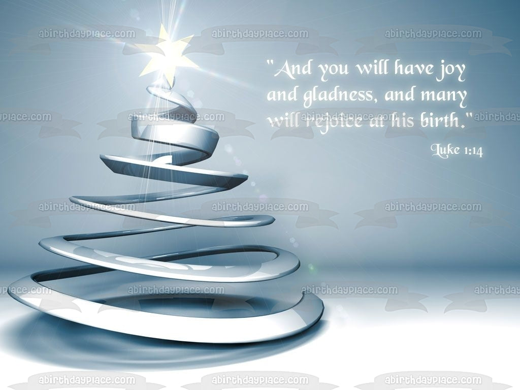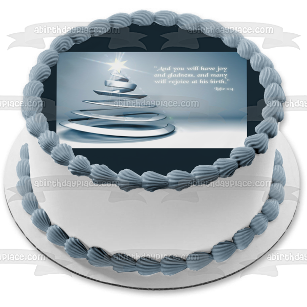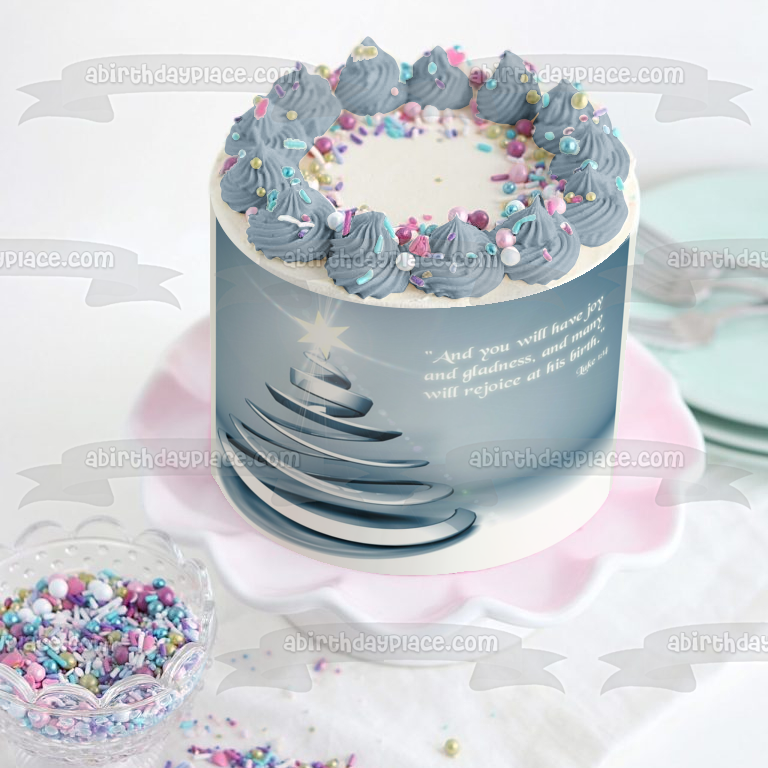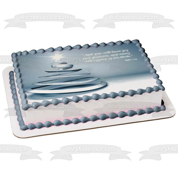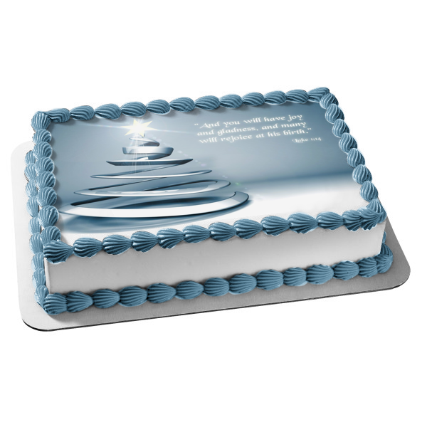 Decorate your Cake with this Merry Christmas Religious Inspiration themed Edible Cake Topper Image featuring a Silver Christmas Tree and the words "And you will have joy and gladness, and many will rejoice at his birth" Luke 1:14!