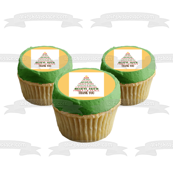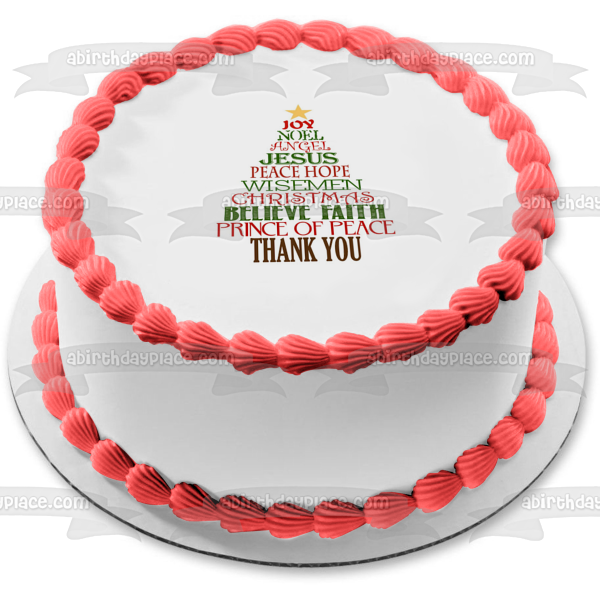 Decorate your Cake with this Merry Christmas Inspirational Words themed Edible Cake Topper Image featuring a Christmas Tree of Holiday wors like Joy, Noel, Angel, Jesus, Believe, Faith and Thank You!