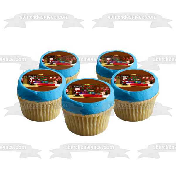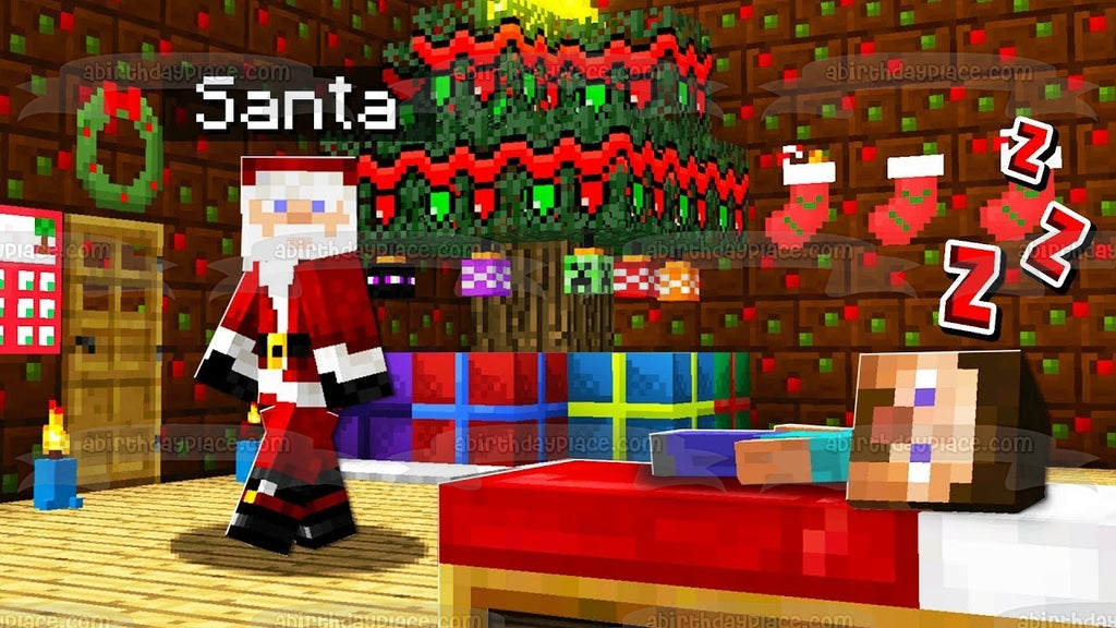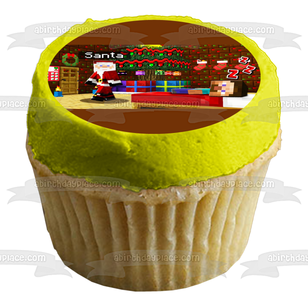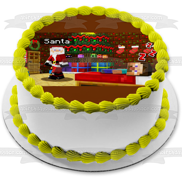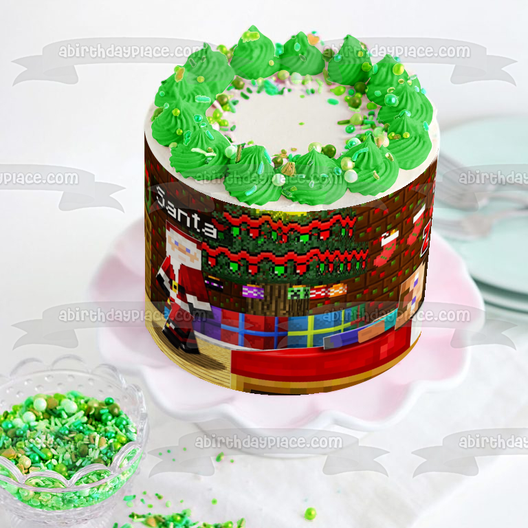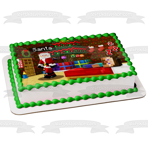 Decorate your Cake with this Minecraft Merry Christmas themed Edible Cake Topper Image featuring Steve, Minecraft Santa Claus, a Christmas Tree and Christmas Presents!