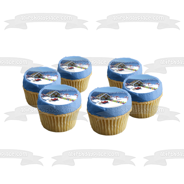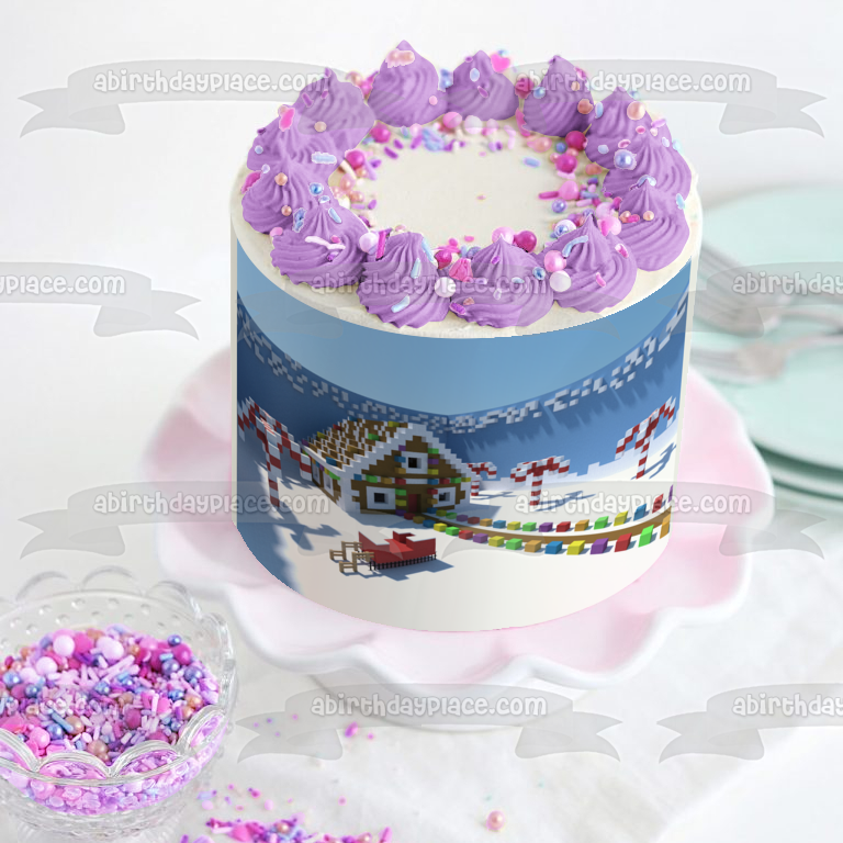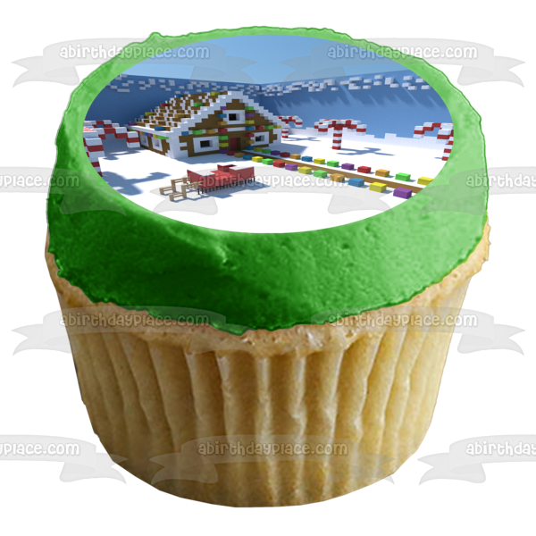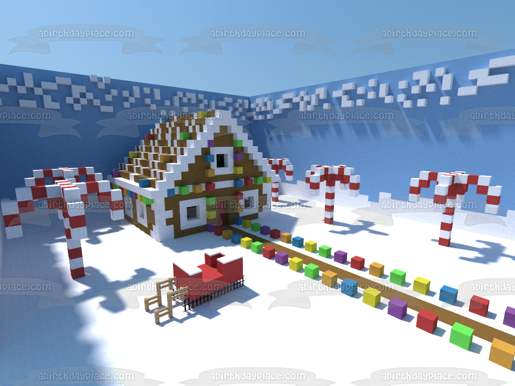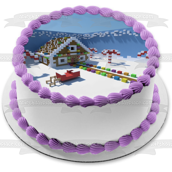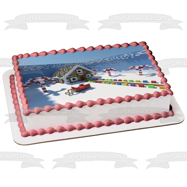 Decorate your Cake with this Minecraft Merry Christmas themed Edible Cake Topper Image featuring a Christmas Decorated Village!