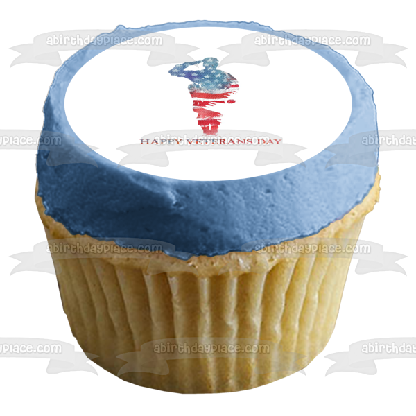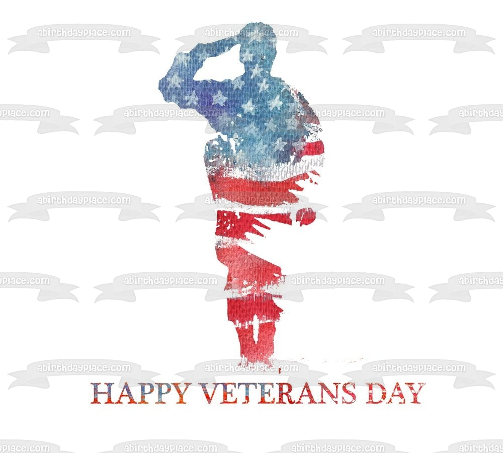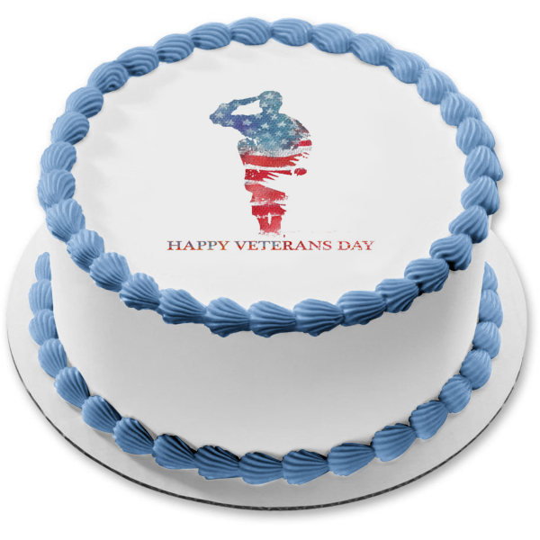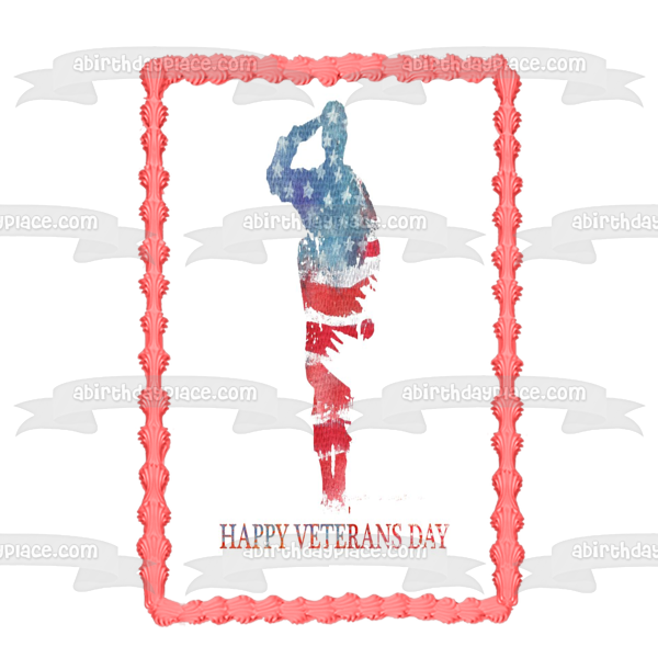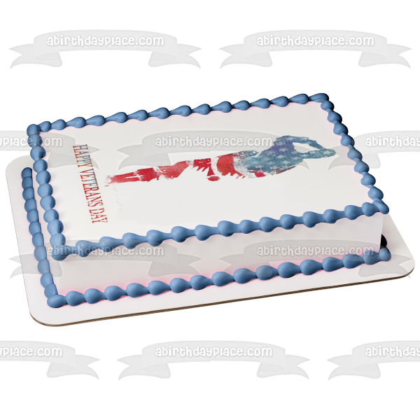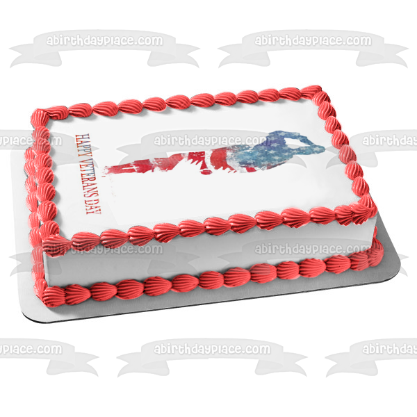 Decorate your Cake with this Happy Veterans Day themed Edible Cake Topper Image featuring a Silouhette of a Soldier and the American Flag!