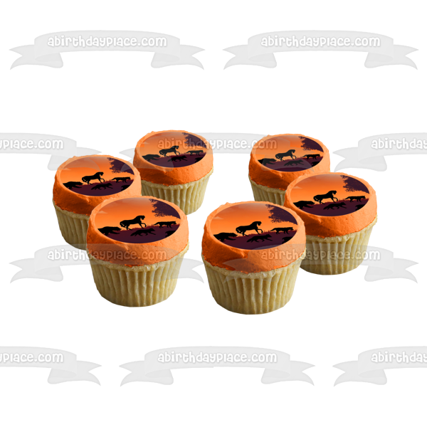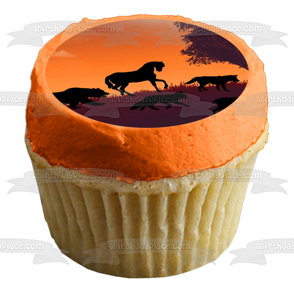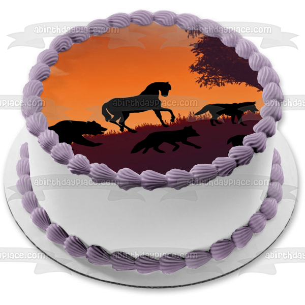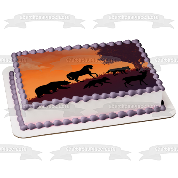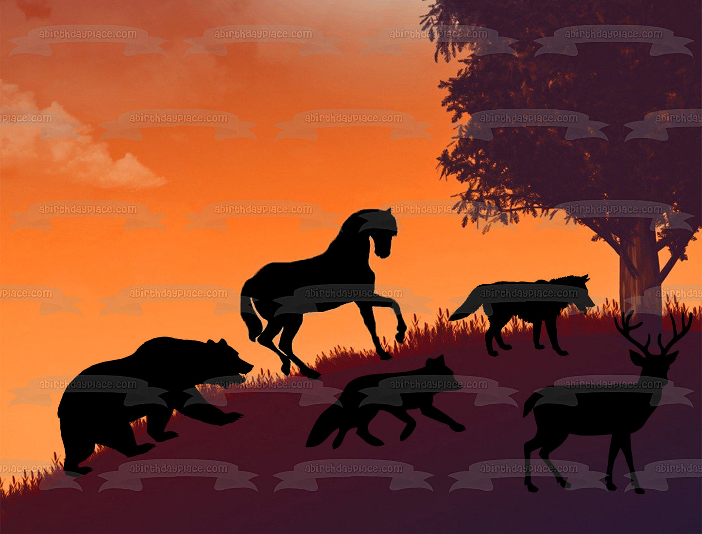 Decorate your Cake with this Wildlife themed Edible Cake Topper Image featuring Silhouette's of a Deer, Wolf, Fox, Horse and Bear Climbing a Hill at Sunset!