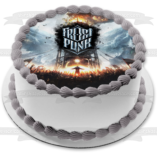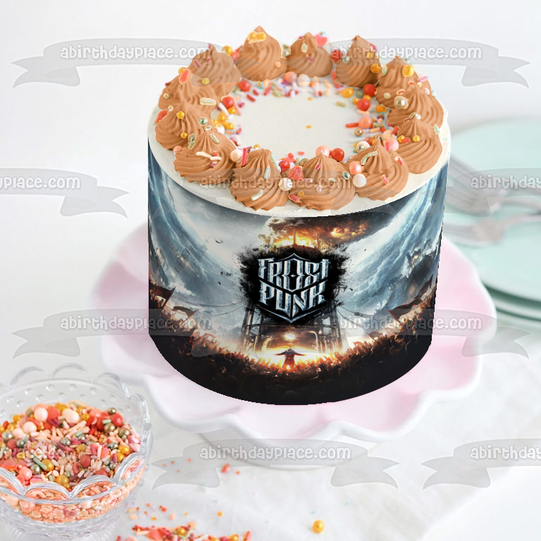 Decorate your cake with this Frostpunk themed Edible Cake Topper Image featuring the Video Game Poster!