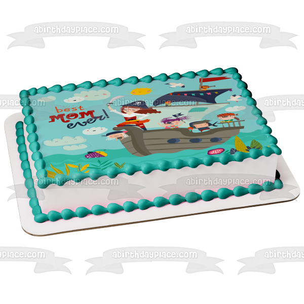 Mother's Day Captain Mommy Pirate Ship Mother and Children Edible Cake Topper Image ABPID53699
