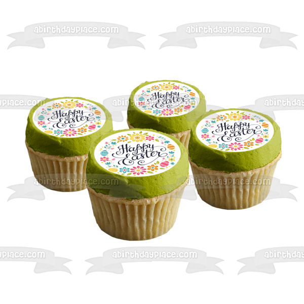 Decorate your Cake with this Happy Easter themed Edible Cake Topper Image featuring Colorful Flowers and Easter Eggs!