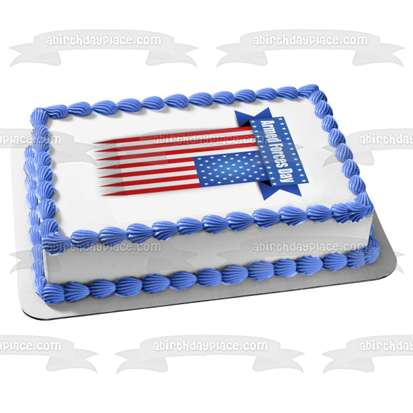 Decorate your Cake with this Armed Forces Day themed Edible Cake Topper Image featuring the American Flag!
