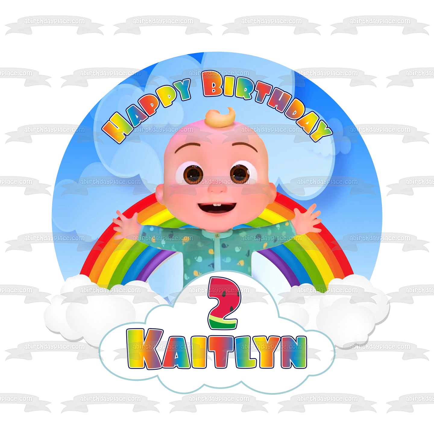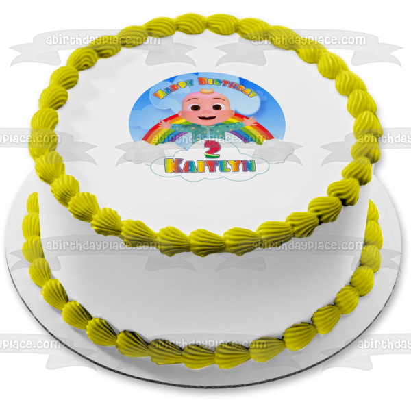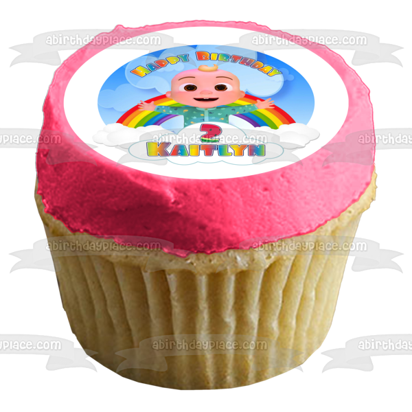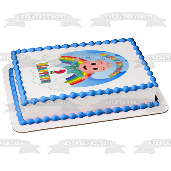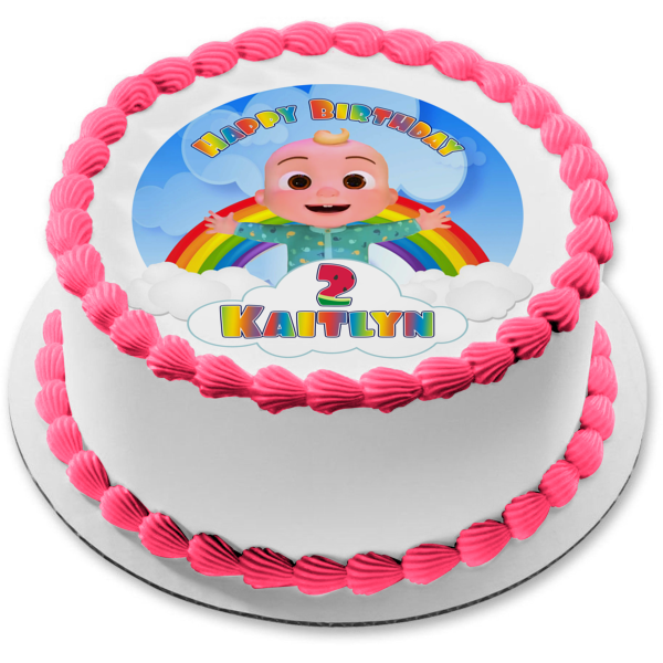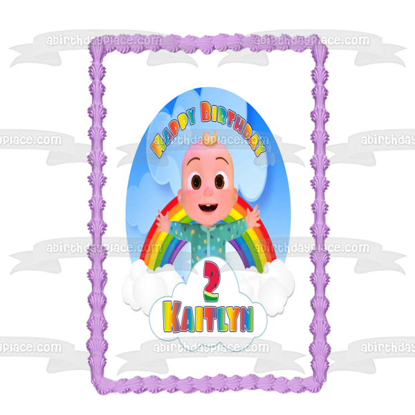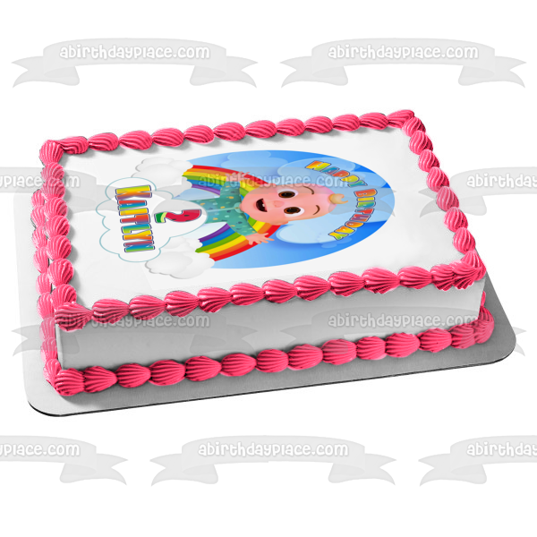 Decorate your Cake with this Cocomelon Happy Birthday themed Edible Cake Topper Image featuring Baby JJ and Your Personalized Name!