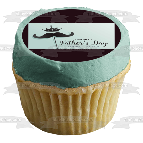 Decorate your Cake with this Happy Father's Day themed Edible Cake Topper Image featuring the words "Best Dad in the World", a Crown and a Mustache!