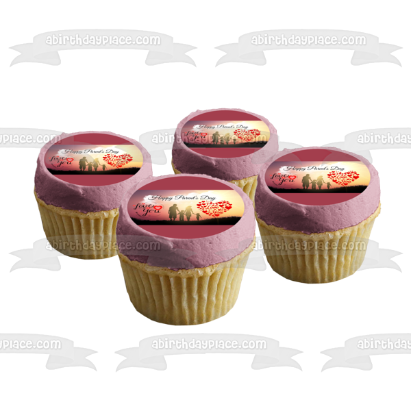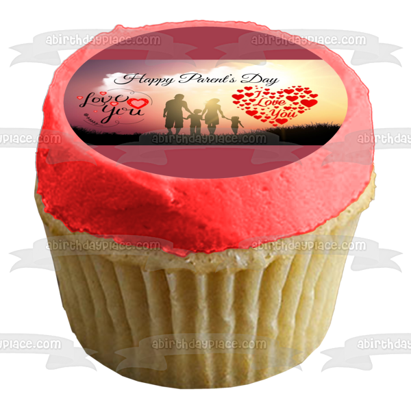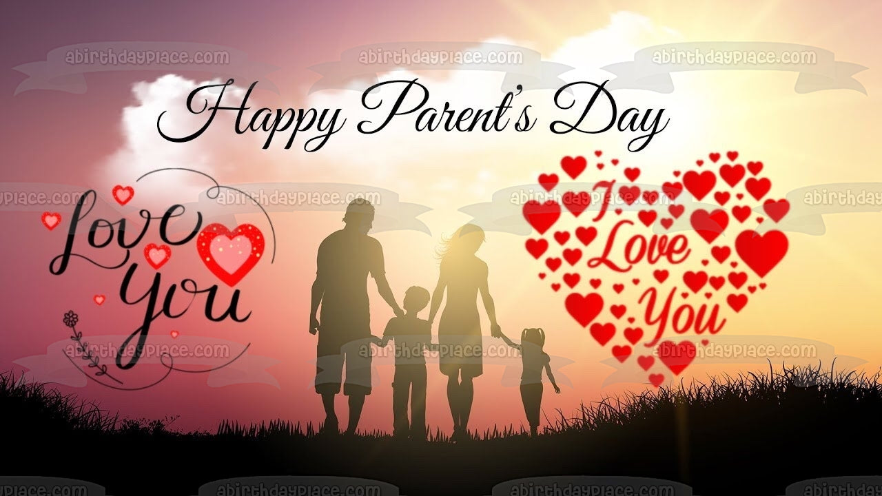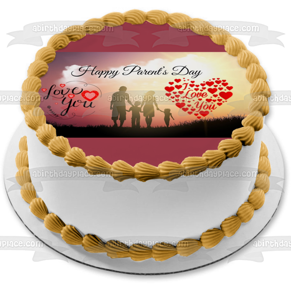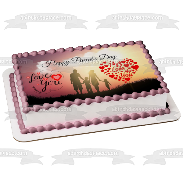 Decorate your Cake with this Happy Parents Day themed Edible Cake Topper Image featuring a Silhouette of a Family, Hearts and the words "Love You"!