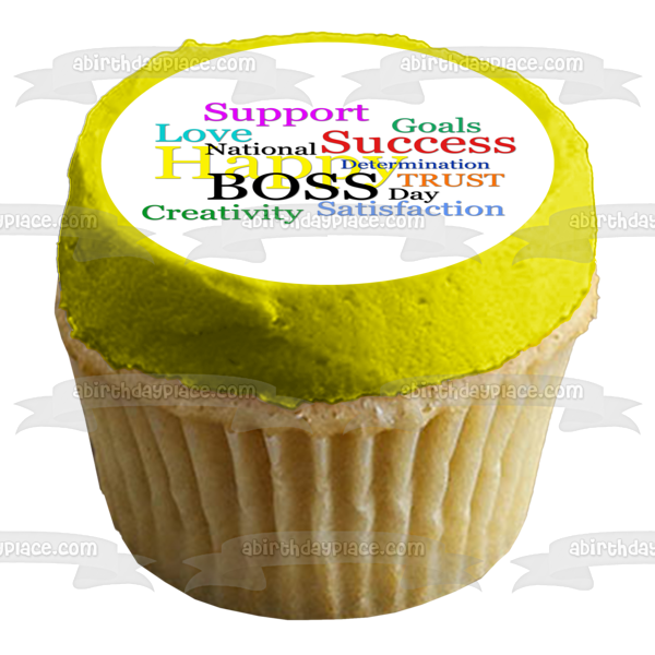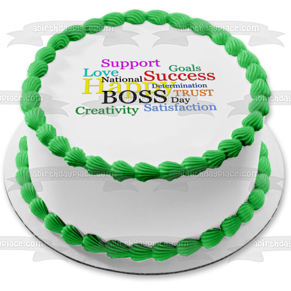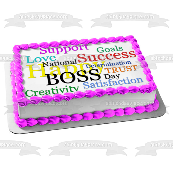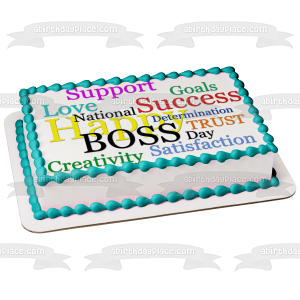 Decorate your Cake with this Happy Boss's Day themed Edible Cake Topper Image featuring the words Support, Goals, Success, Love and Creativity!