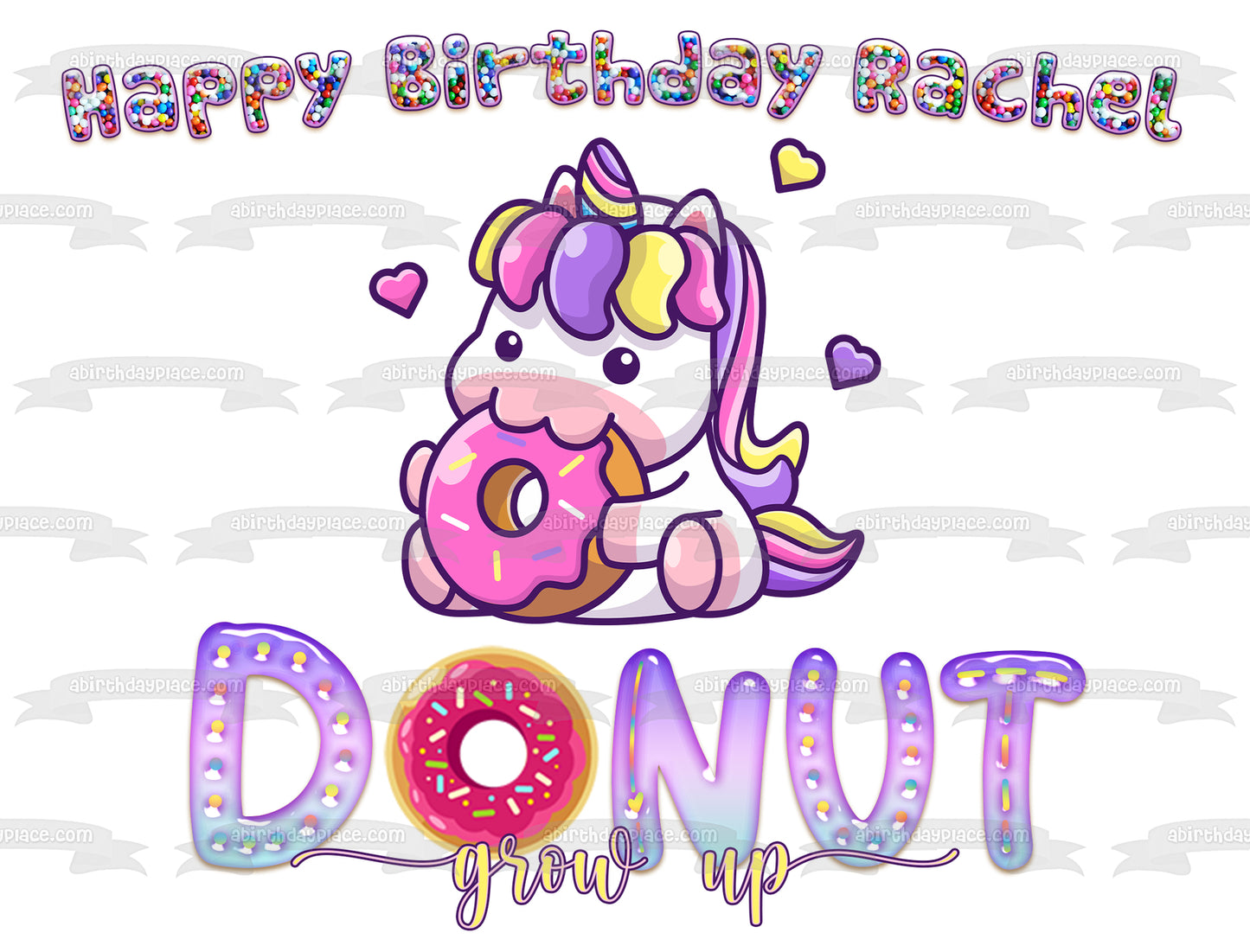 Decorate your Cake with this Donut Grow Up themed Edible Cake Topper Image featuring a Unicorn Eating a Donut!