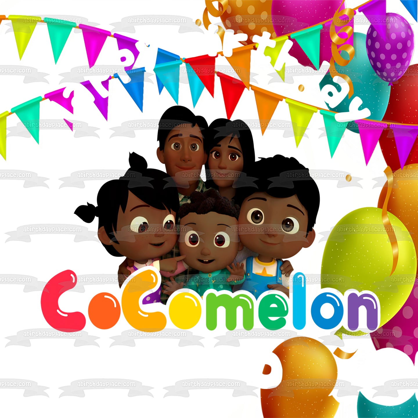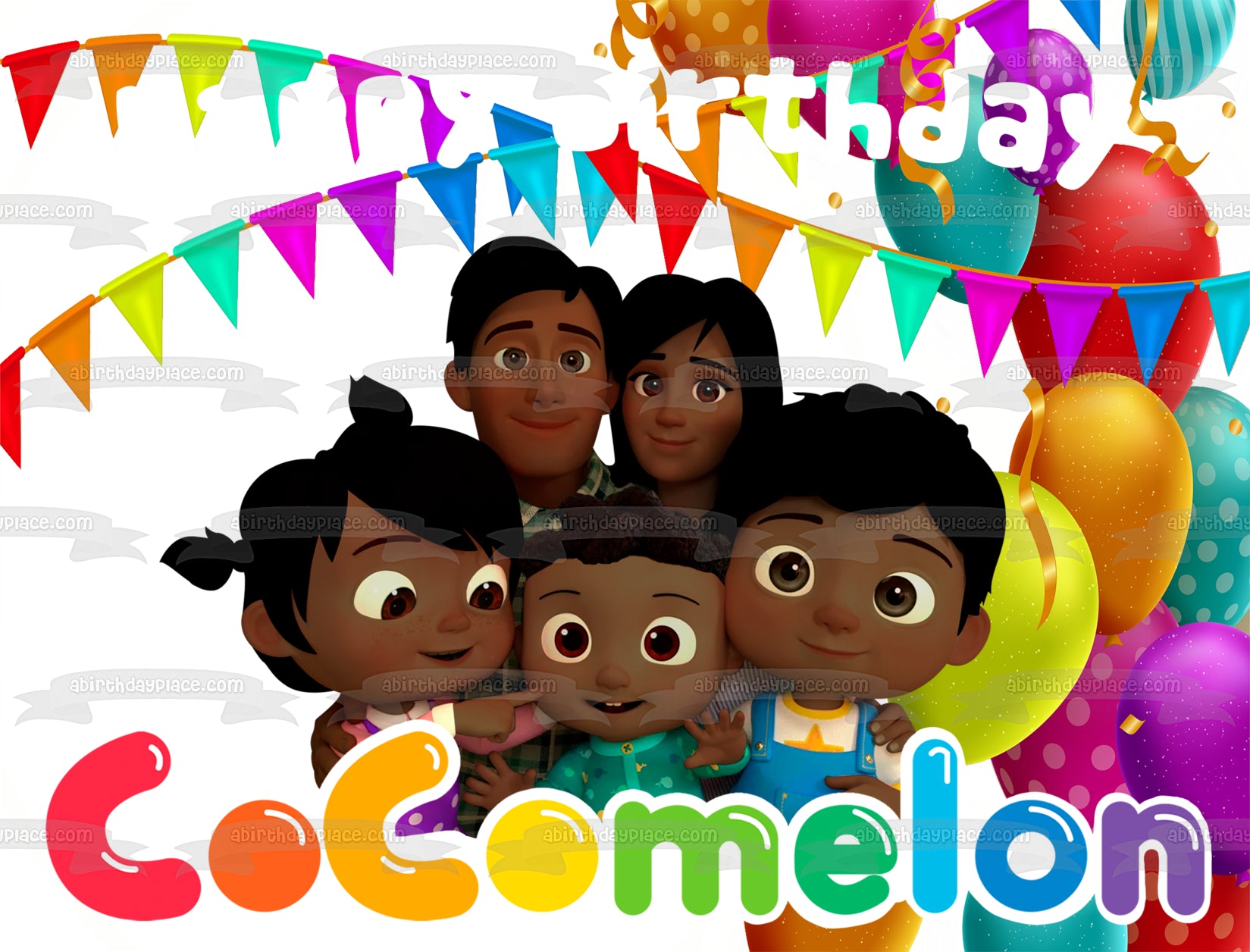 Decorate your Cake with this Multiracial Cocomelon Family themed Edible Cake Topper Image featuring Happy Birthday Balloons and Banners!