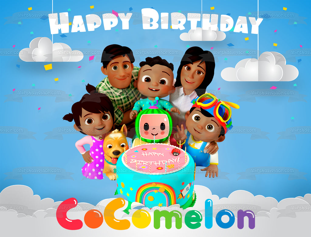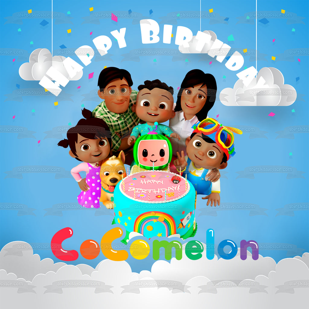 Decorate your Cake with this Multiracial Cocomelon Family themed Edible Cake Topper Image featuring Baby JJ and a Birthday Cake!