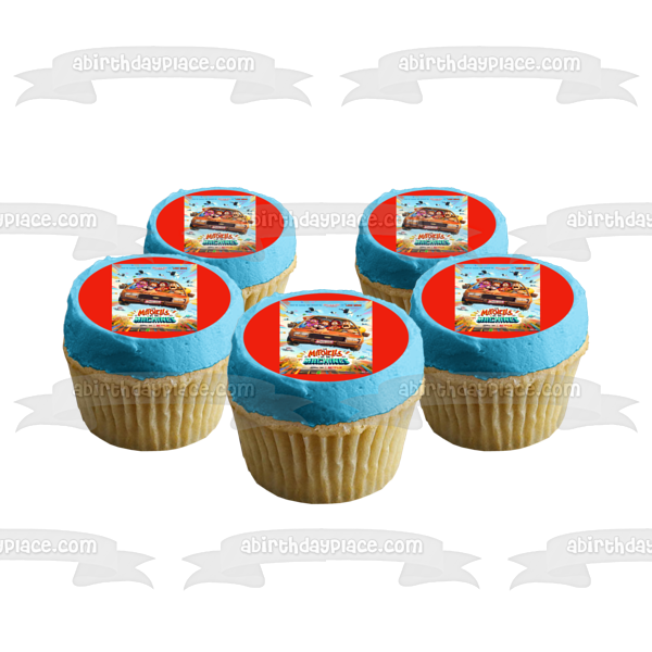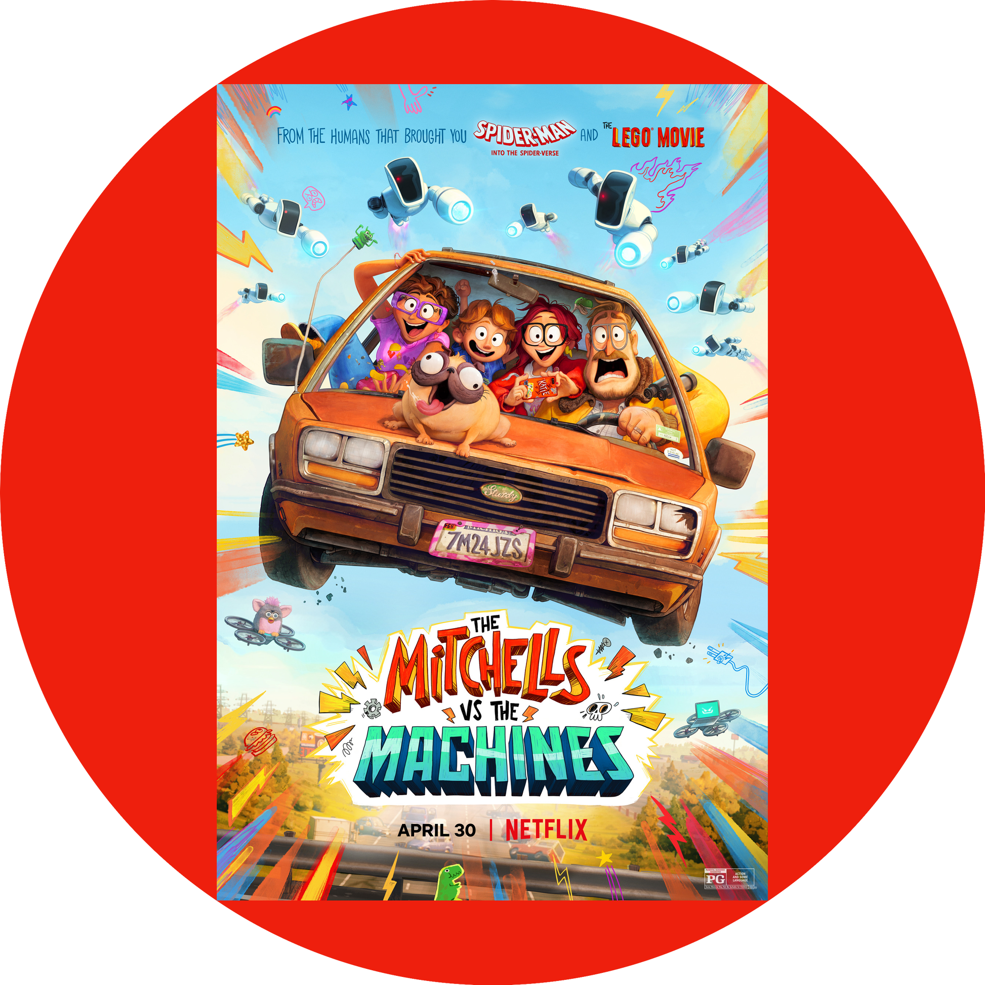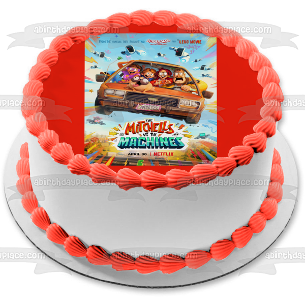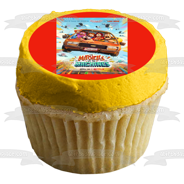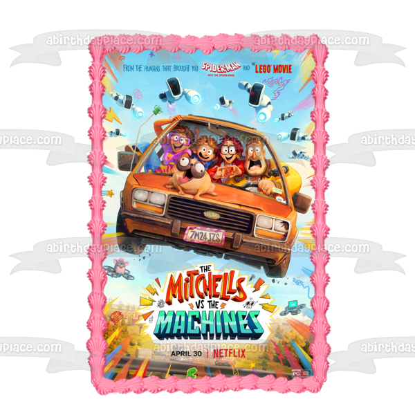 Decorate your Cake with this The Mitchells Vs. The Machines themed Edible Cake Topper Image featuring Katie, Aaron, Linda, Rick and Monchi on the Movie Poster!
