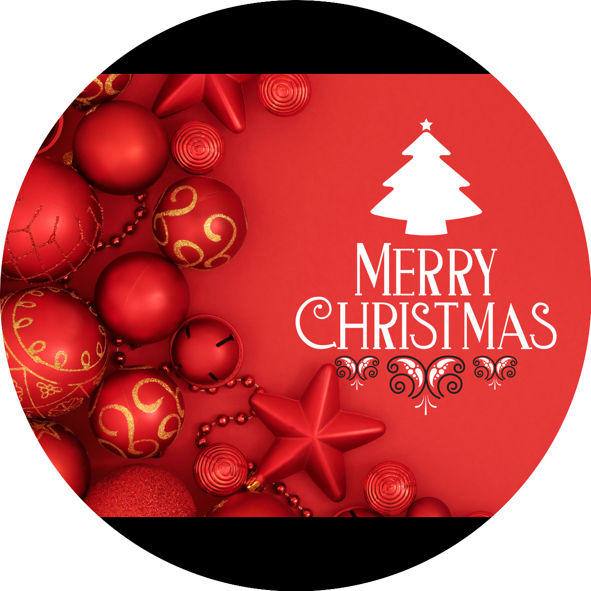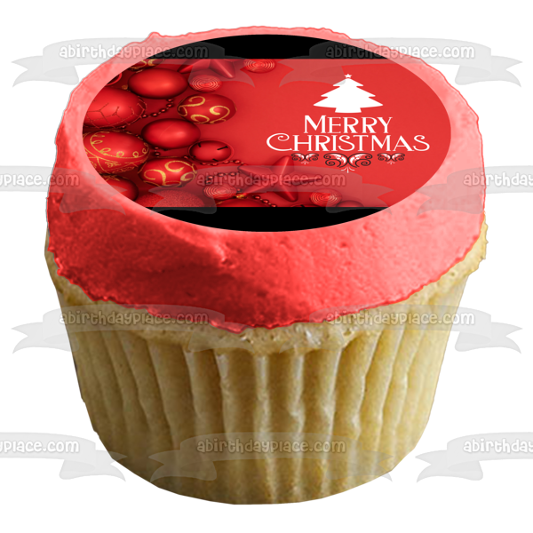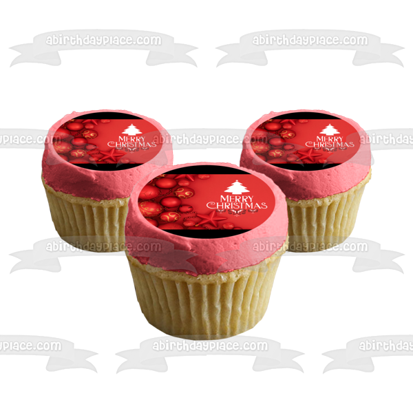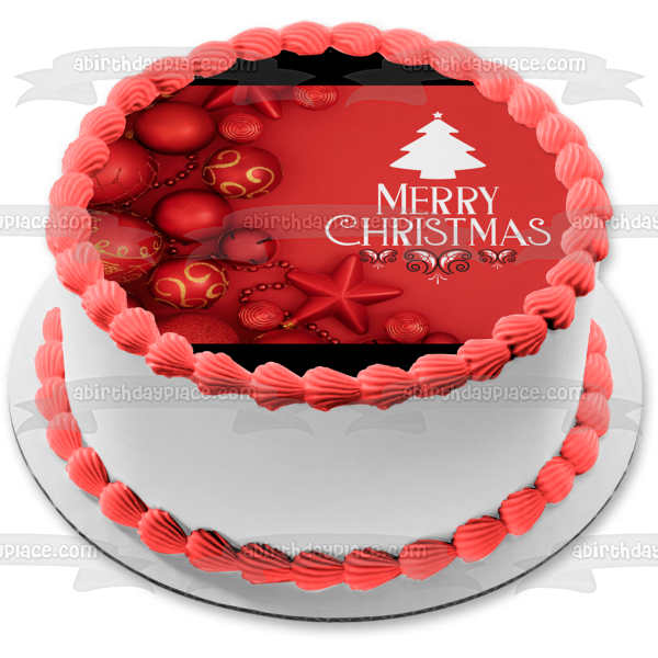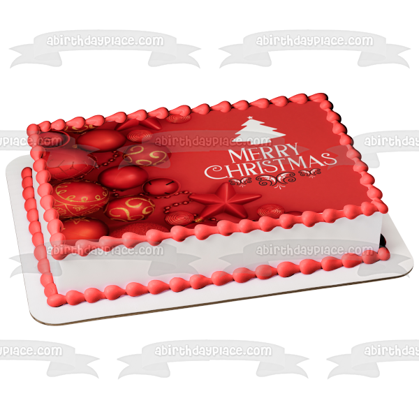 Decorate your Cake with this Merry Christmas themed Edible Cake Topper Image featuring Red Christmas Ball Ornaments!