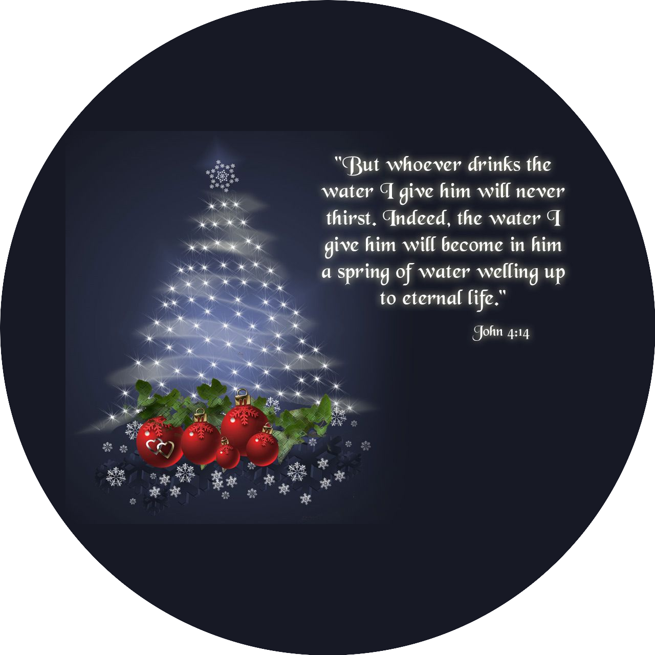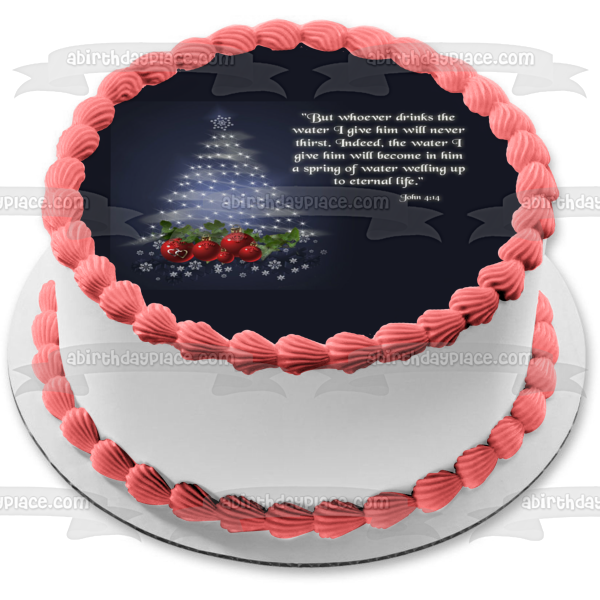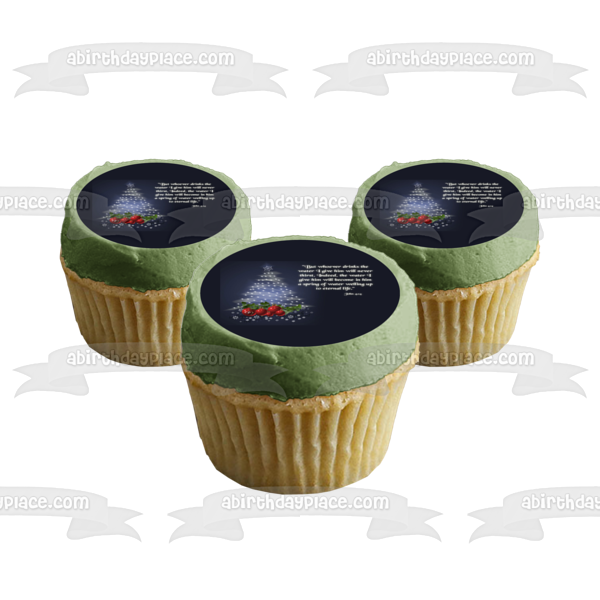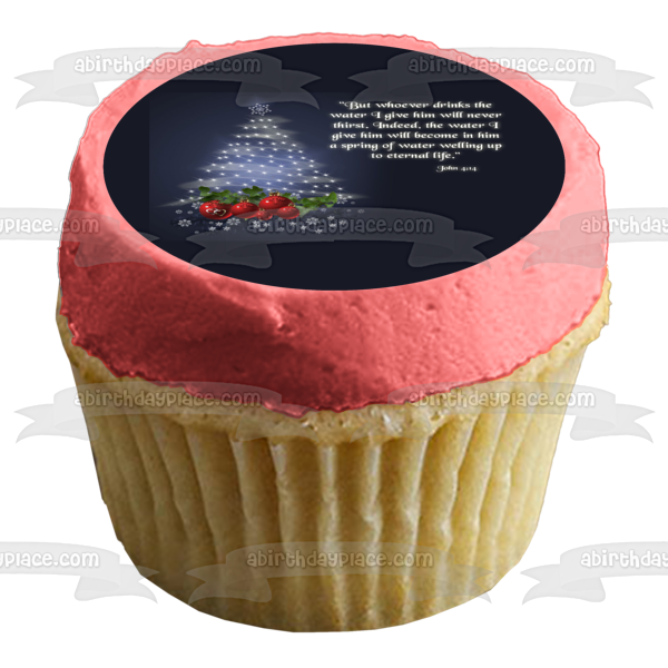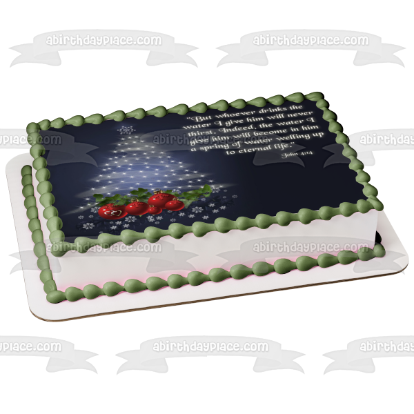 Decorate your Cake with this Merry Christmas themed Edible Cake Topper Image featuring a Christmas Tree and a Religious Quote!